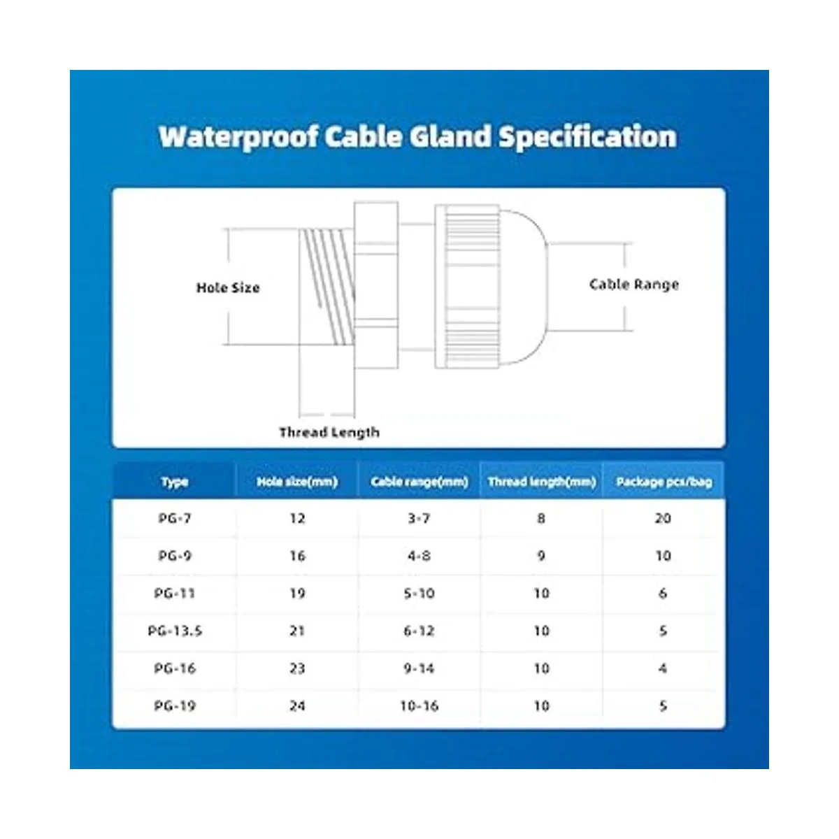 Lo que obtienes 6 prensaestopas modelo de PG7, PG9, PG11, PG13.5, PG16, PG19, 50 piezas en total. Son perfectamente suficientes para que elijas