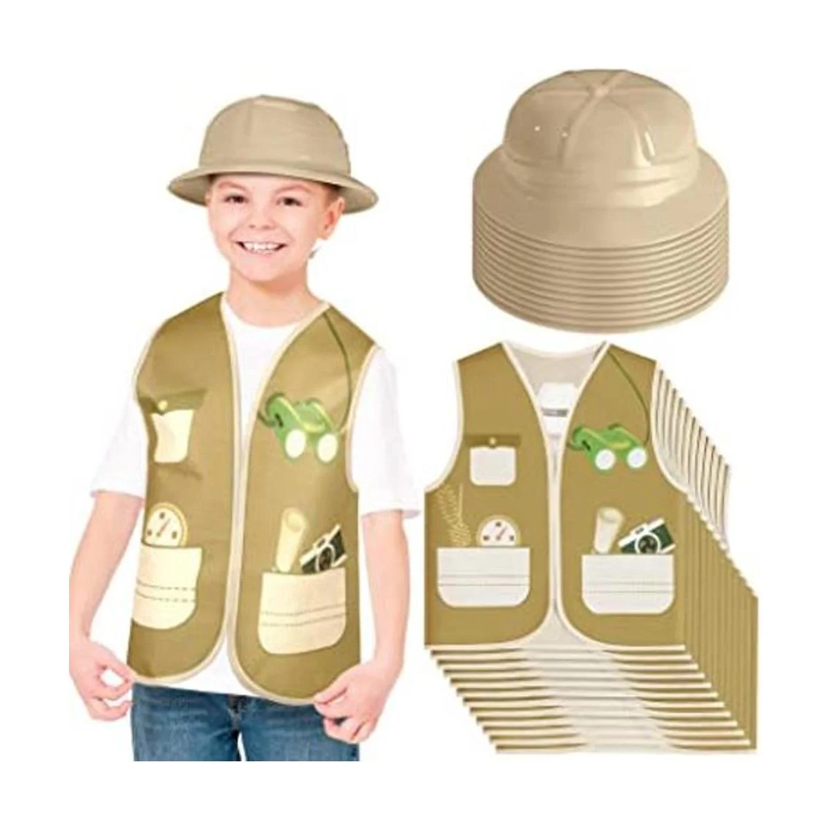 Chaleco explorador de 12 piezas para niños y 12 sombreros de fiesta, sombreros exploradores de plástico, chaleco para niños, suministros de fiesta de la selva, actividades al aire libre, regalos de cumpleaños de Halloween