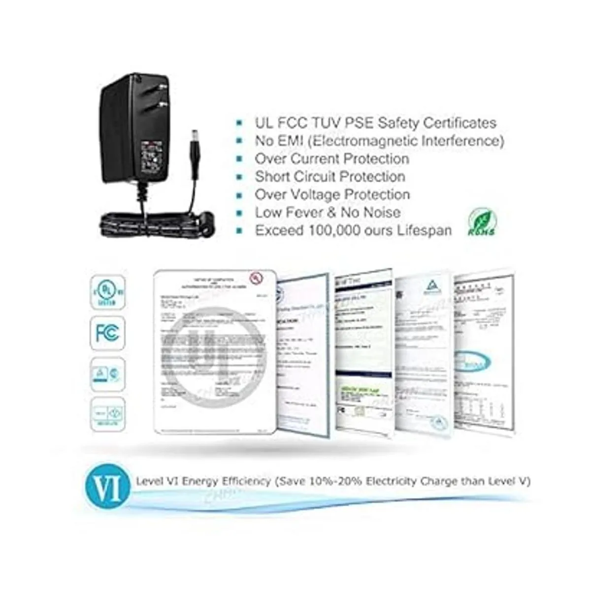 Ahorro de dinero y adaptador de CA más seguro Eficiencia energética de nivel VI ahorra un 1520 de carga de electricidad que el nivel V. Certificados de seguridad UL cUL FCC PSE TUV RoHS aprobados: 2 años de garantía de reemplazo gratuito/anillo magnético antiinterferente eficiente para evitar EMI interferencia electromagnética / cortocircuito, sobrevoltaje y protección de corriente, cable de alimentación de 18 Awg, excede 10 años de vida útil, fiebre baja, sin ruido, caja de embalaje al por menor de alta calidad a prueba de golpes