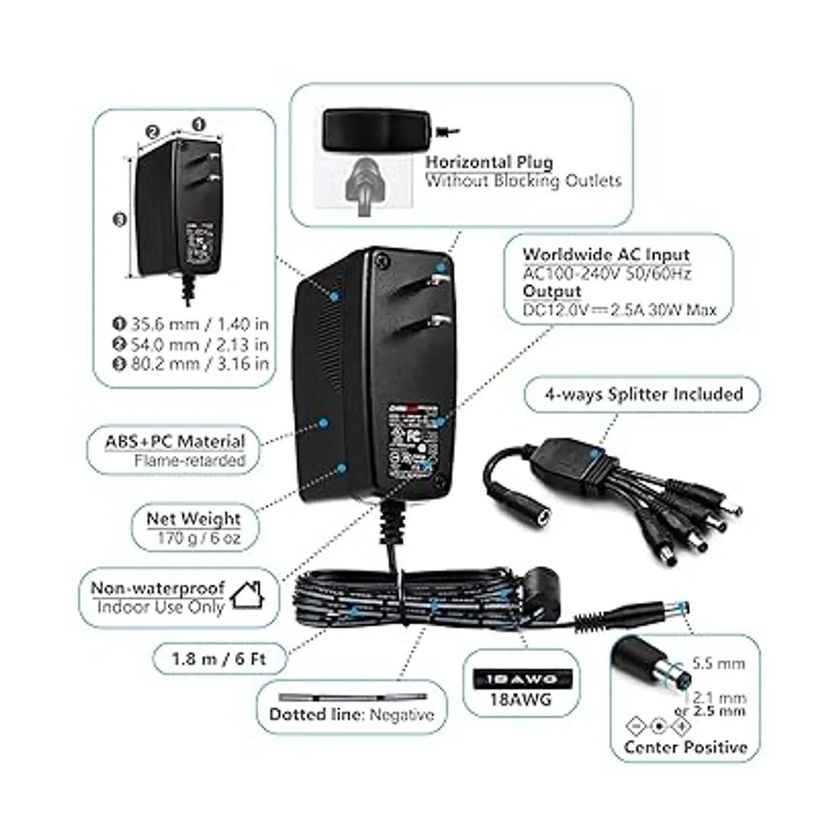 Información general Entrada de CA 100V240V 50/60Hz / 12Vdc 0 2500mA 30W Salida / Cable de alimentación de 6 pies 5.9 ft / enchufe de barril autoadaptable para bith 0.083 in x 0.217 in central positivo/incluye un cable divisor de alimentación de 1 a 4