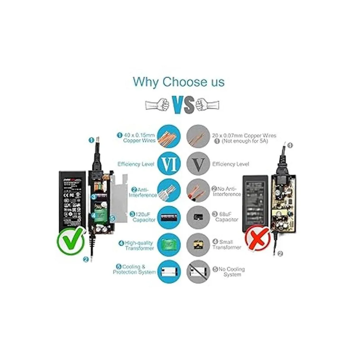 Garantía: 1 año de reemplazo / devolución gratuita. Servicio al cliente en línea 24×7 Protección contra cortocircuitos Corte de sobrecarga de corriente Térmico automático Alta eficiencia Cable de alimentación de cobre 100 de 1.575 x 0.006 in con enchufe de 2 clavijas Fácil instalación Voltaje constante de 12 V Baja temperatura y sin ruido Potencia completa 60 W Larga vida útil Alta calidad a prueba de golpes Caja de embalaje Caja de plástico negra segura con adaptador de corriente LED de 12 V