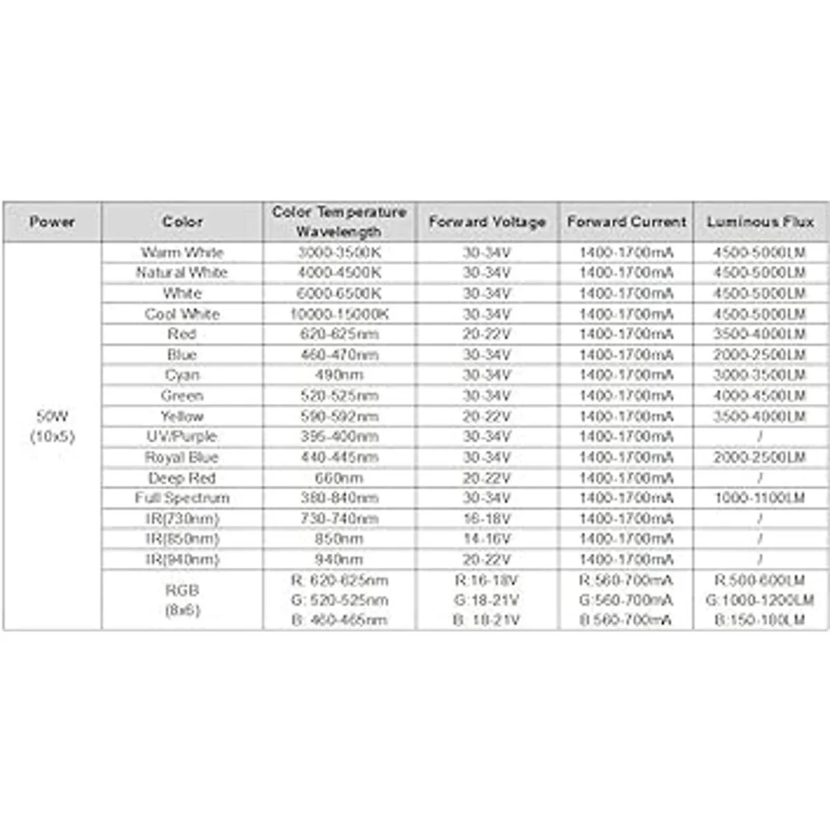 Chanzon Chip LED de alta potencia de 50 W de espectro completo para plantas 380 nm 840 nm 1500 mA CC 30 V 34 V 50 Watt Componentes de diodos emisores SMD COB 50 W cuentas para bricolaje lámpara de cultivo de flores hidropónicas