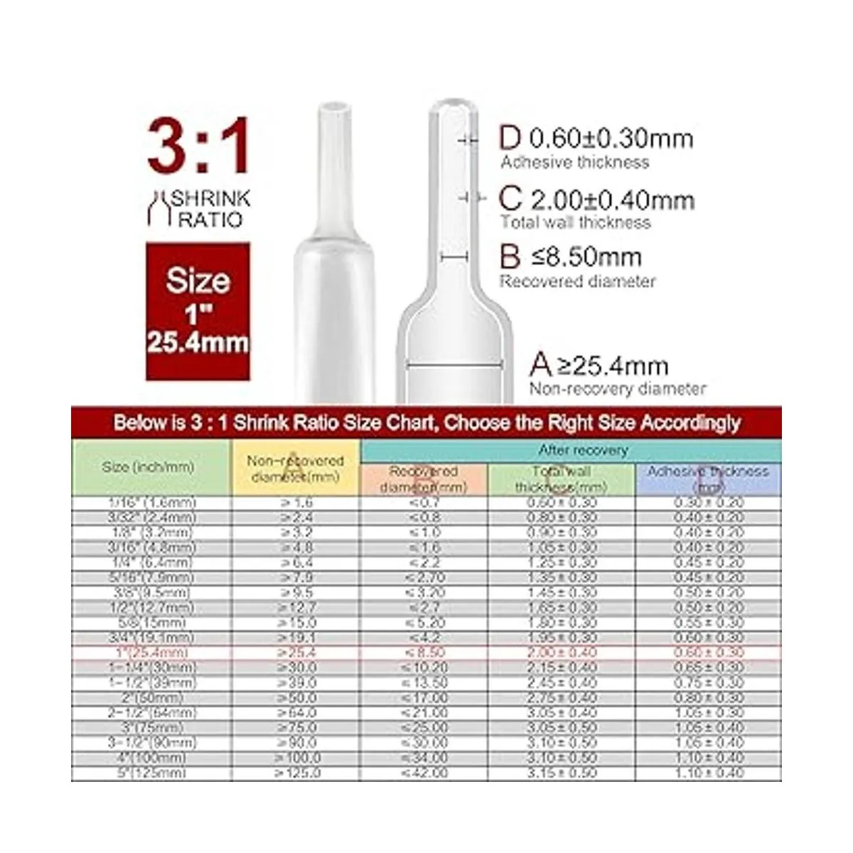 Relación 31: se encoge a 1/3 de su diámetro original, doble pared forrada con pegamento en el interior para un sello impermeable de grado marino, con cinta antiadherente sin interior pegajoso, diámetro 1 0.98 pulgadas 1.000 in o 0.984 in, 4 pies de largo, consulta la tabla de diámetros imagen 3.