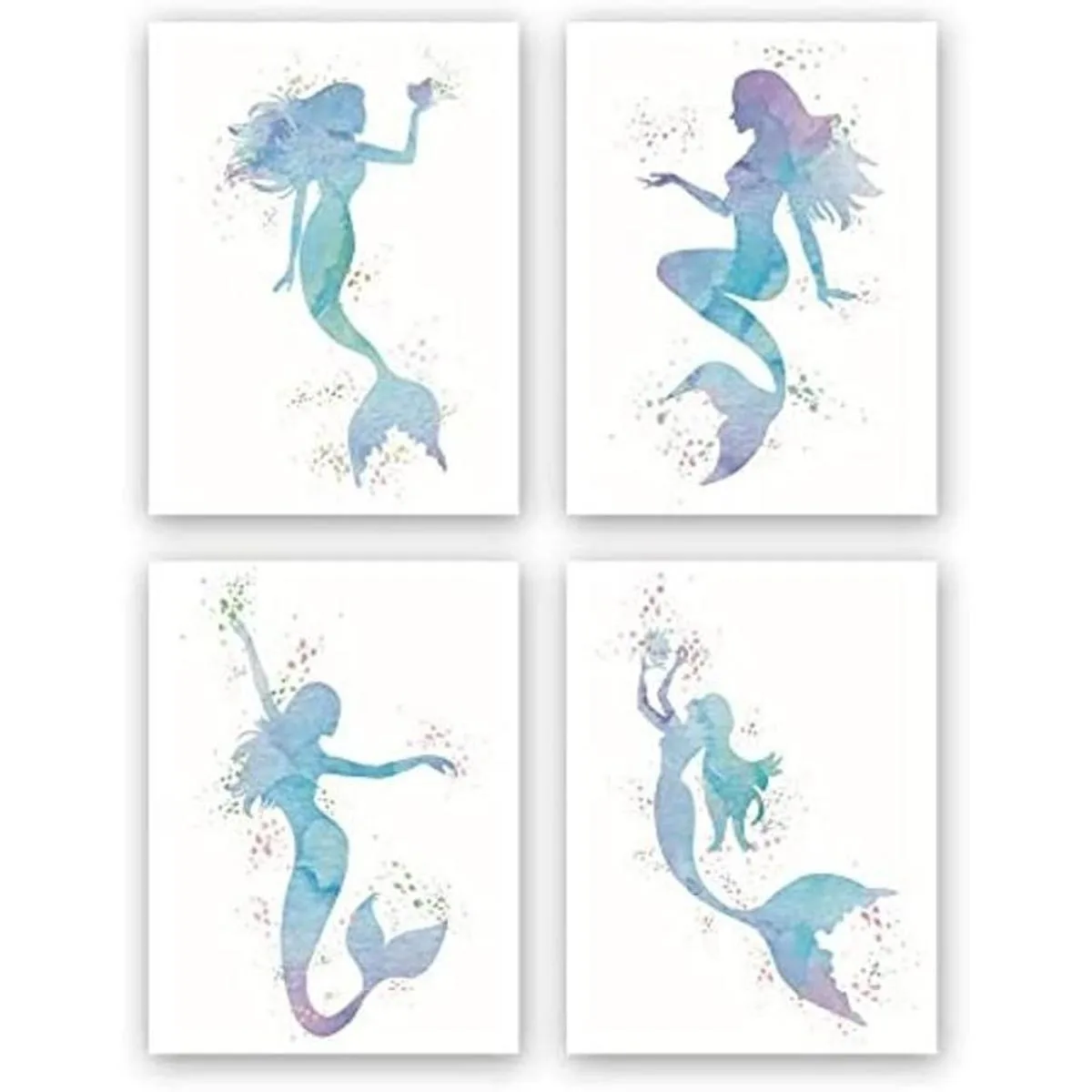 Contenido y tamaño de los pósteres artísticos: silueta de sirena de acuarela en 9 elegantes movimientos. No incluye marco: 7.9 x 9.8 in. Juego de 4 pósteres artísticos.