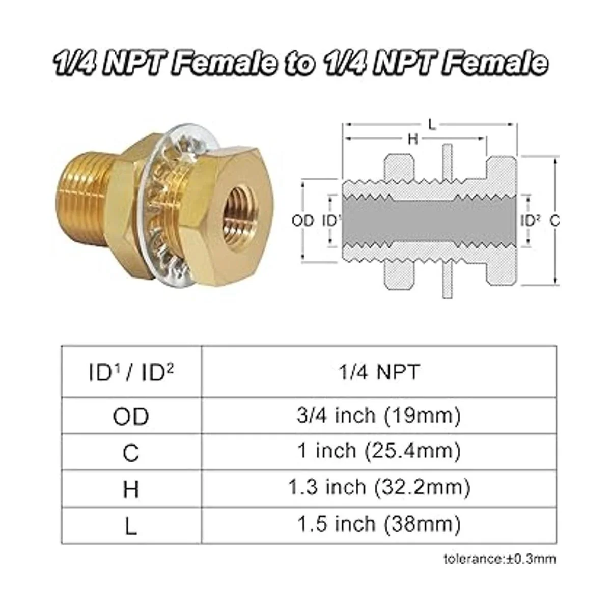 Dimensiones Ajuste mínimo agujero de 0.75 pulgadas de diámetro. Diámetro interior: rosca NPT hembra de 1/4 pulgadas a rosca NPT hembra de 1/4 pulgadas. Diámetro exterior: 0.748 in.