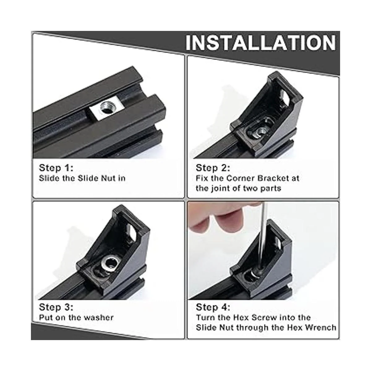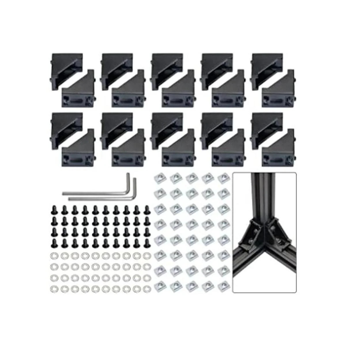 Contenido del paquete: 20 soportes de esquina, 40 tornillos hexagonales, 40 tuercas deslizantes, 40 arandelas y 2 llaves hexagonales.
