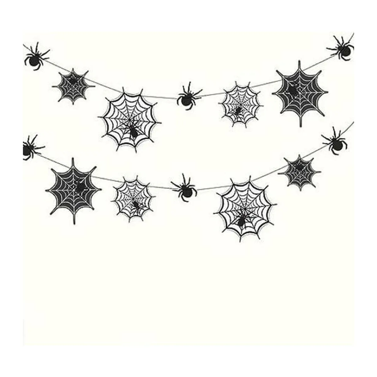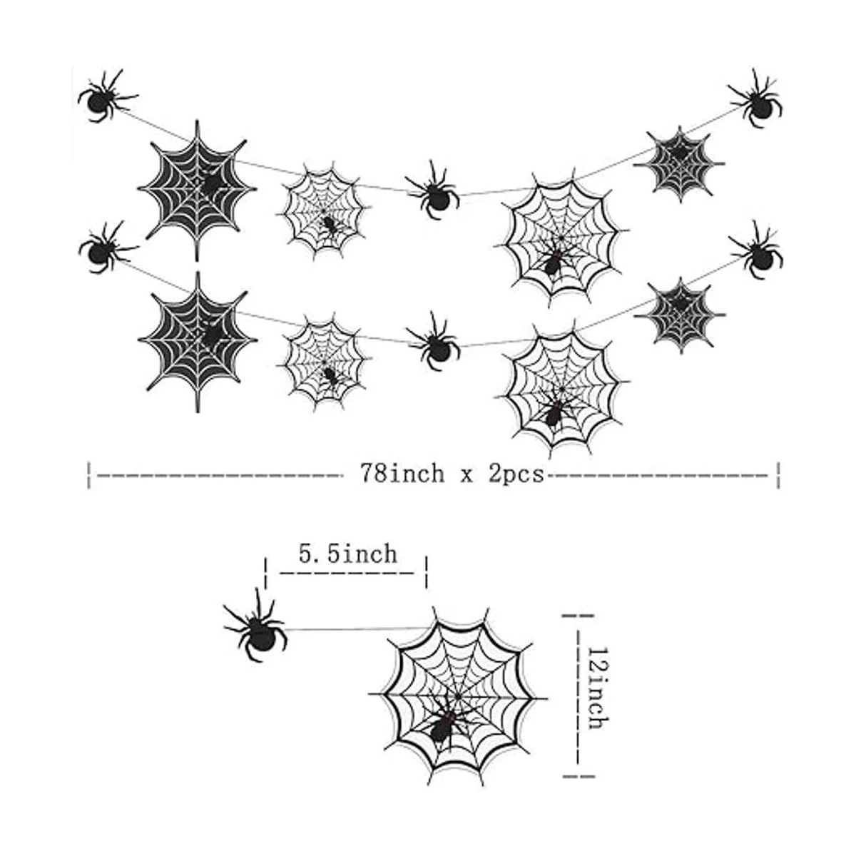 Este paquete incluye: 2 hebras de guirnaldas de araña y telaraña de 6.5 pies de largo, total de 13 pies. Cada guirnalda incluye 3 arañas, 4 telarañas en 2 tamaños y en color blanco o negro. 14 unidades. Las redes más grandes son de 12 pulgadas de diámetro.