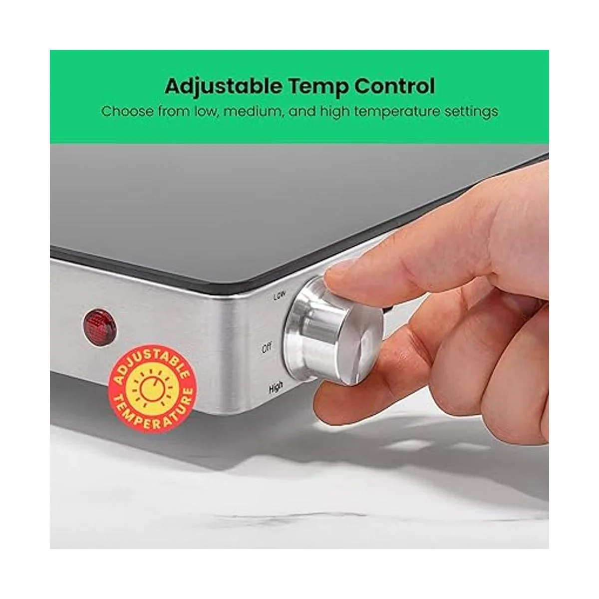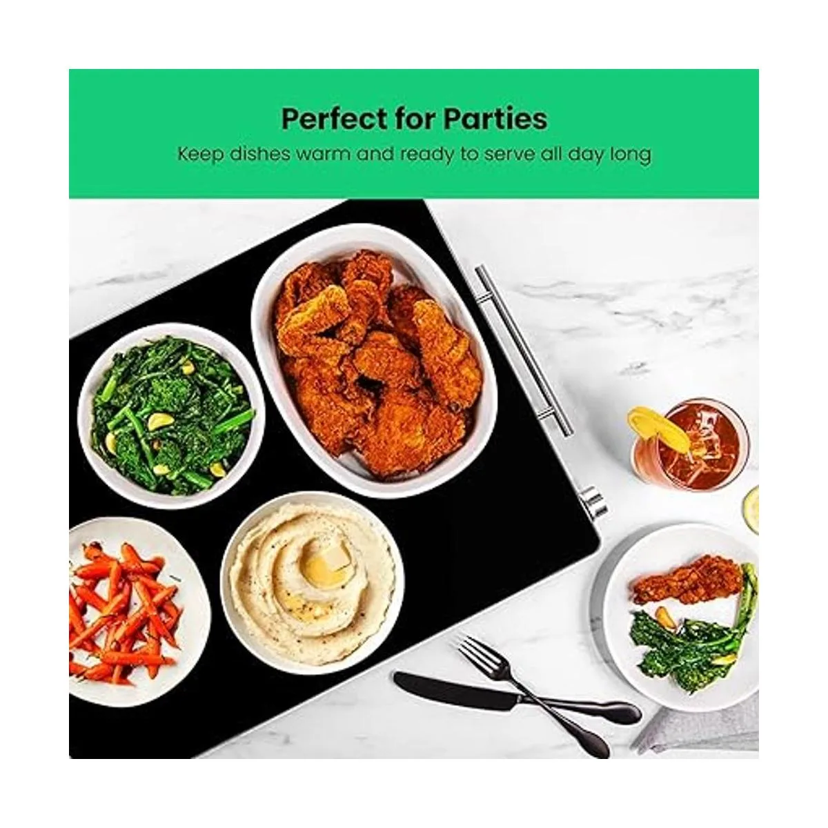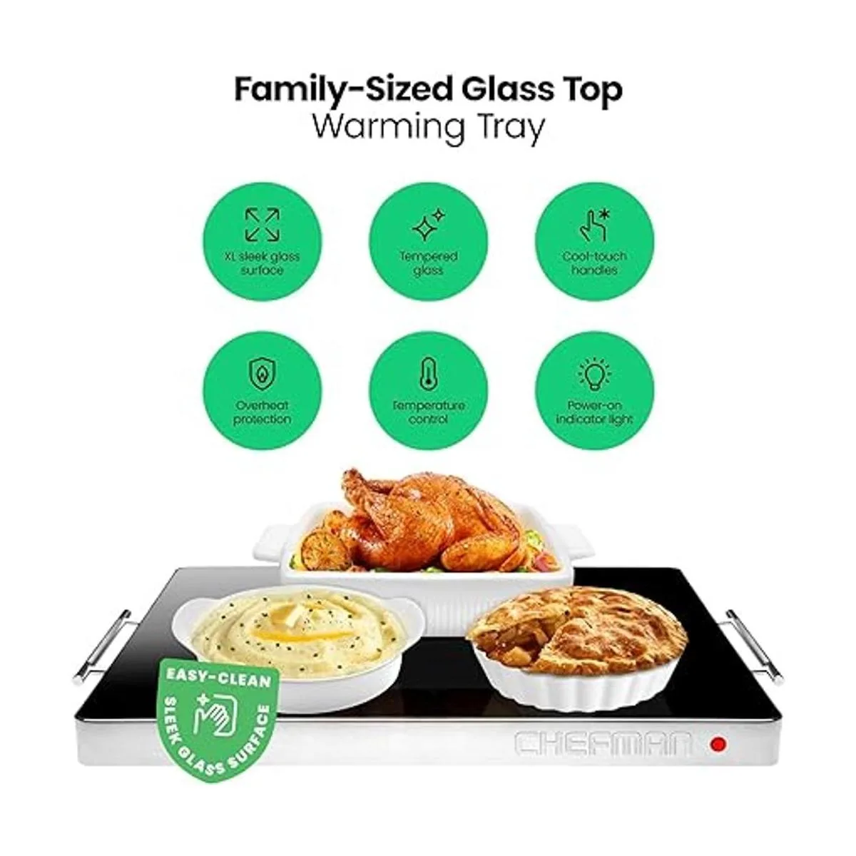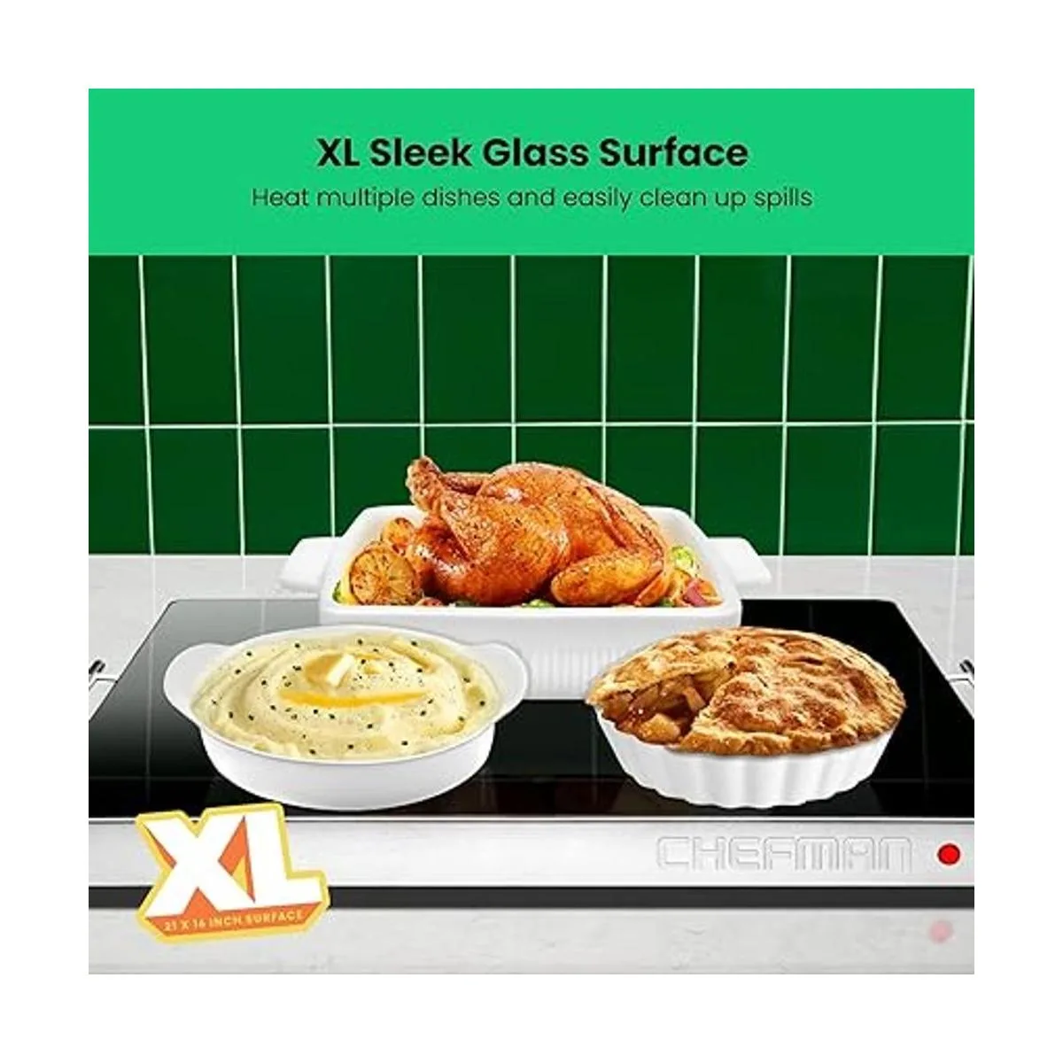 FAMILY SIZE WARMING TRAY: The 21 x 16 surface hot plate can fit several dishes at once and looks great on any counter top, table, or buffet. The adjustable temperature control and size makes it suitable for family dinners, Sunday football gatherings, holiday meals, or other big parties and events.