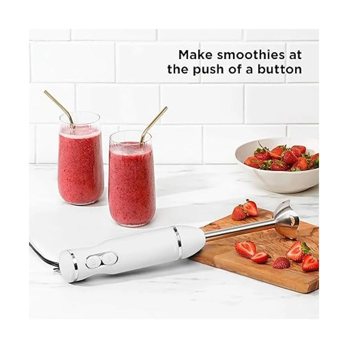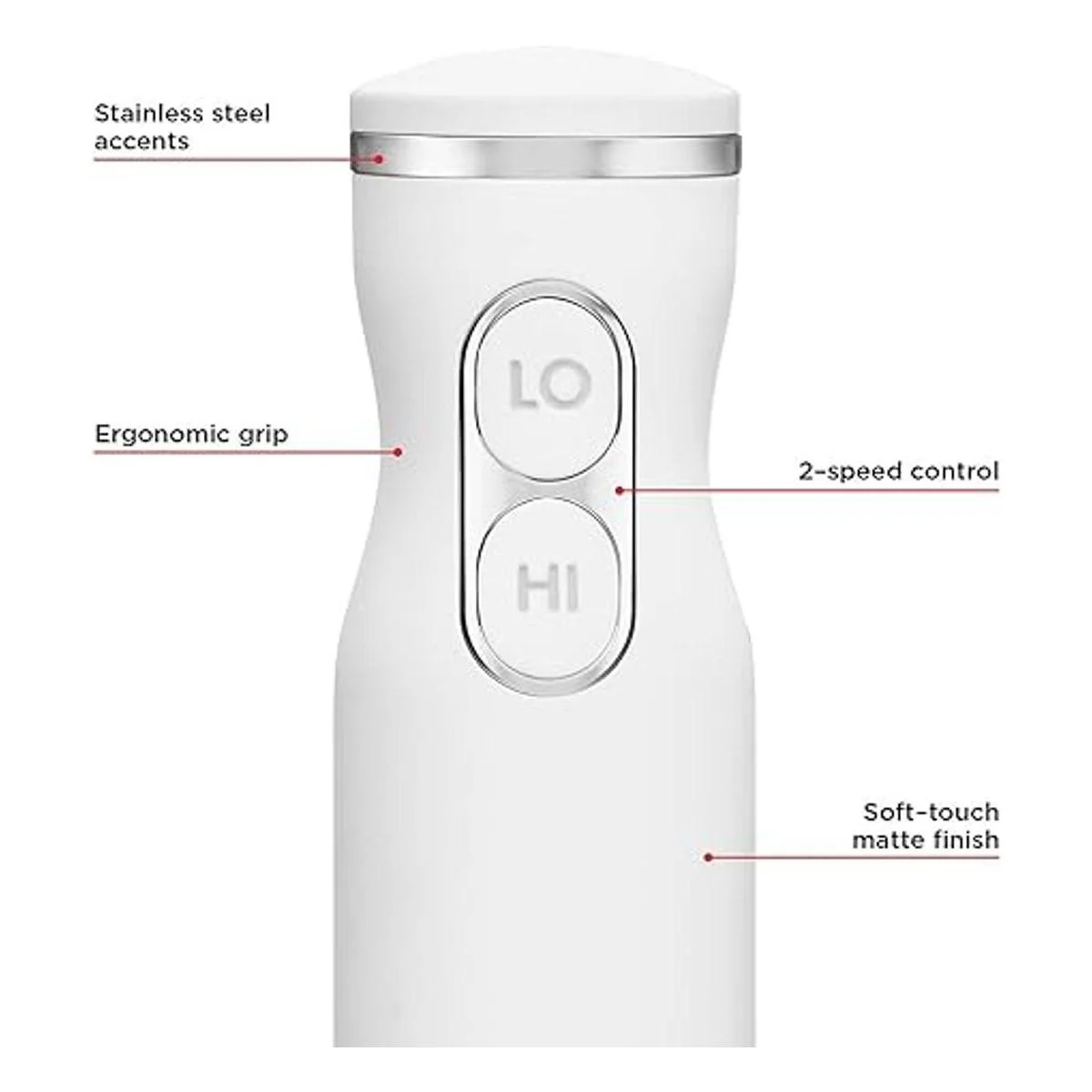 BETTER HOME BLENDING: The highspeed, quiet 300watt immersion blender transform food and crushes ice at the push of a button. Enjoy an easy blending process with 2 onetouch speeds: HI LO. The sleek, ergonomic easygrip handheld design with softtouch finish was built to put pureeing power in the palm of your hand, for even results in seconds.