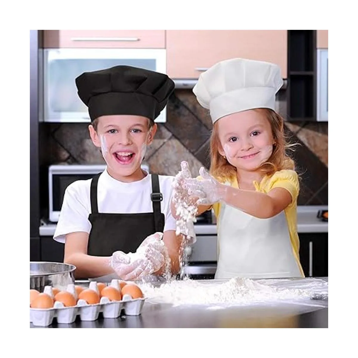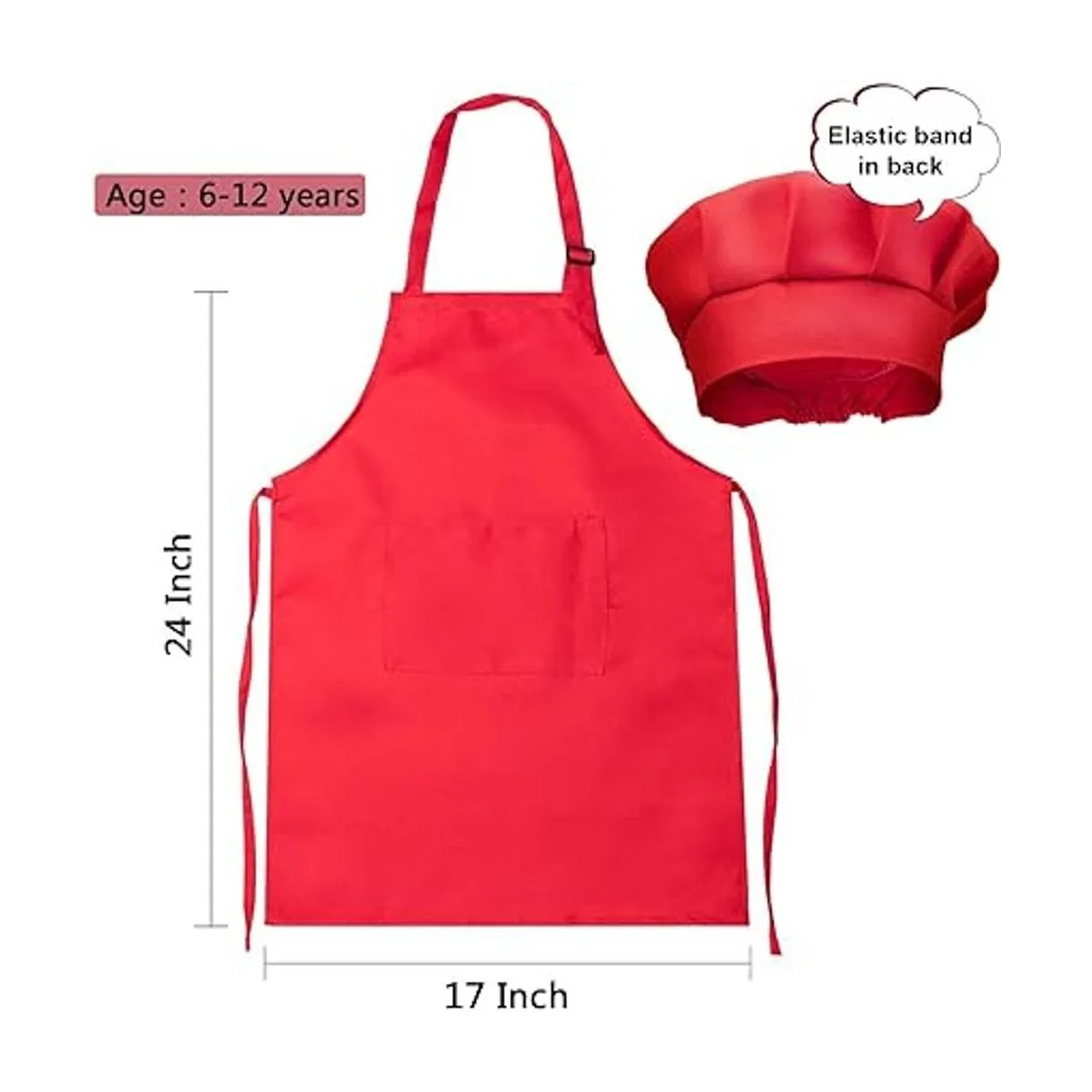 Tamaño: el tamaño del delantal de cocina para niños es de aprox. 17.1 x 25.2 in, con correa ajustable para el cuello para que los niños se ajusten libremente, cada corbata del delantal es de aprox. 17.1 in, el sombrero de chef con banda elástica en la parte trasera se adapta a la circunferencia de la cabeza de la mayoría de los niños