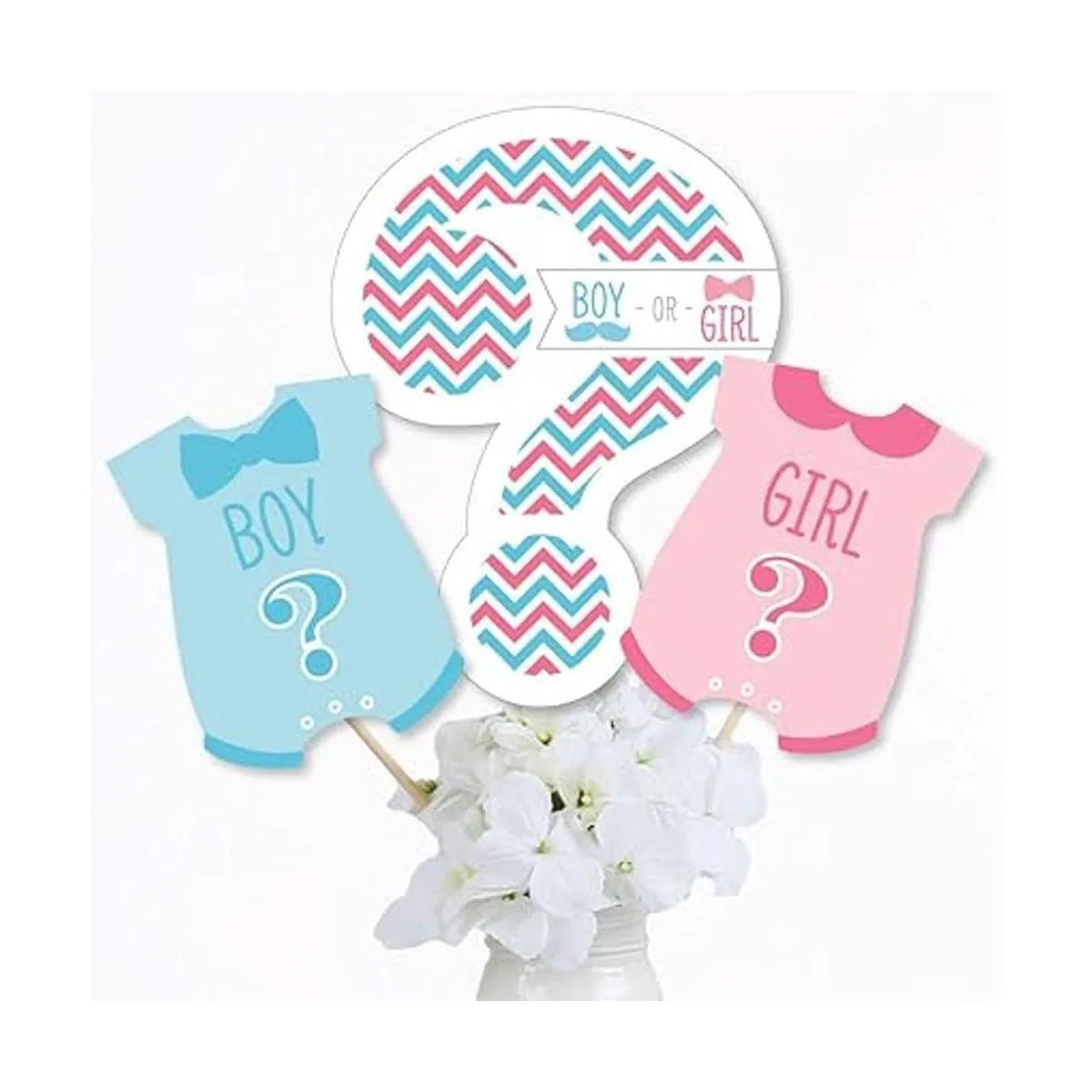 Chevron Gender Reveal Centerpiece Sticks Tamaño cinco marcas de preguntas Toppers de mesa, 8,25 de ancho x 11 de alto; cinco toppers de mesa color rosa, 5 de ancho x 6,75 de alto; y cinco topperes de mesa de bodysuit azules, 5 de ancho x 6,75 de alto. El diseño único y la variedad de piezas hacen de este kit de decoración de mesa una impresionante adición a cualquier fiesta temática de género.