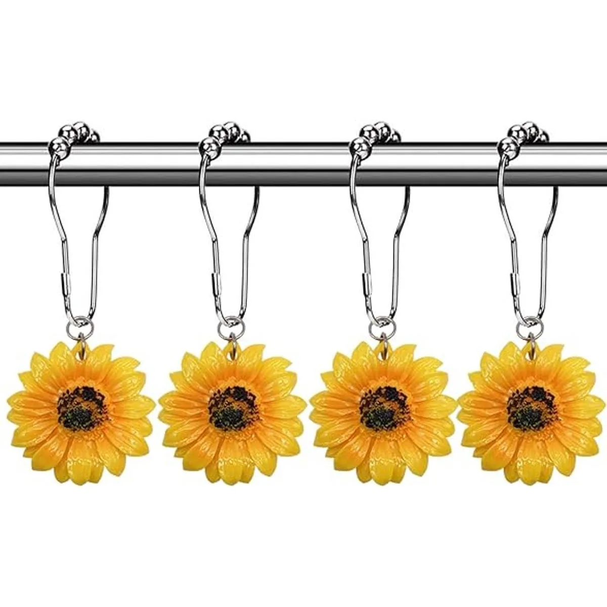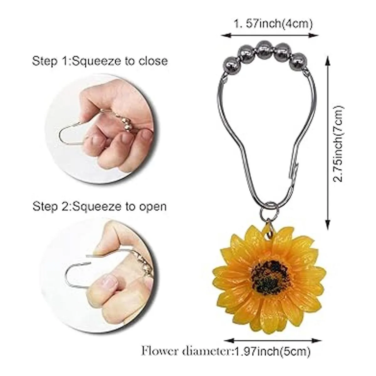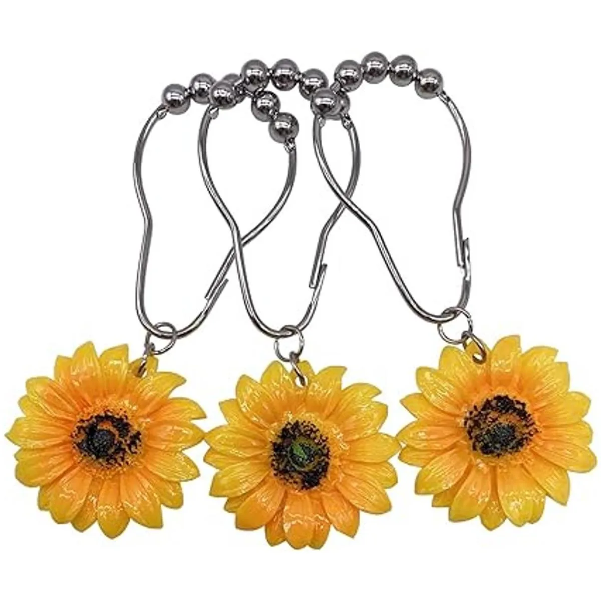 CHICTIE Ganchos para cortina de ducha de girasol, ganchos decorativos para cortina de ducha con flores amarillas, 12 anillos de ducha resistentes al óxido para juego de baño girasol amarillo
