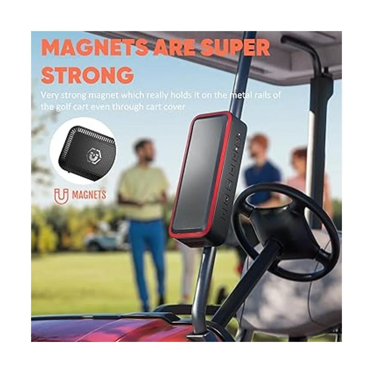 Altavoz Bluetooth magnético y fácil de usar: el altavoz Bluetooth para carrito de golf con imanes súper fuertes integrados que es conveniente con el soporte, se puede pegar al instante a cualquier superficie magnética, se fija de forma segura al carrito de golf incluso a través de la cubierta del carrito. El agarre magnético se mantiene en su lugar en tu carrito de golf incluso en terrenos irregulares. El mosquetón integrado es una ventaja para una fijación fácil y segura a tu bolsa de palo de golf y bolsa de soporte de golf.