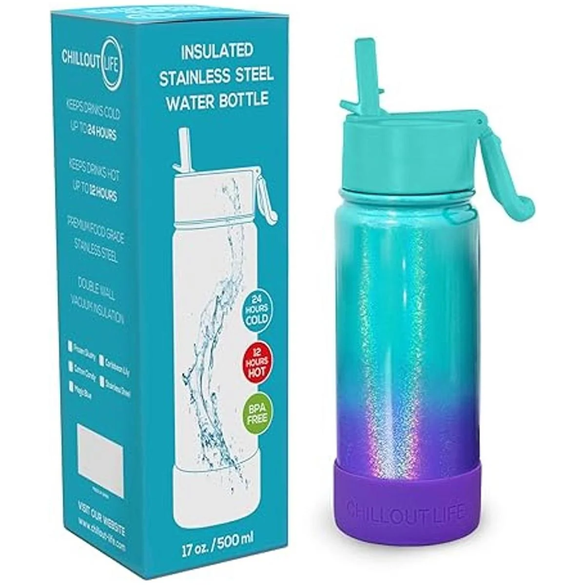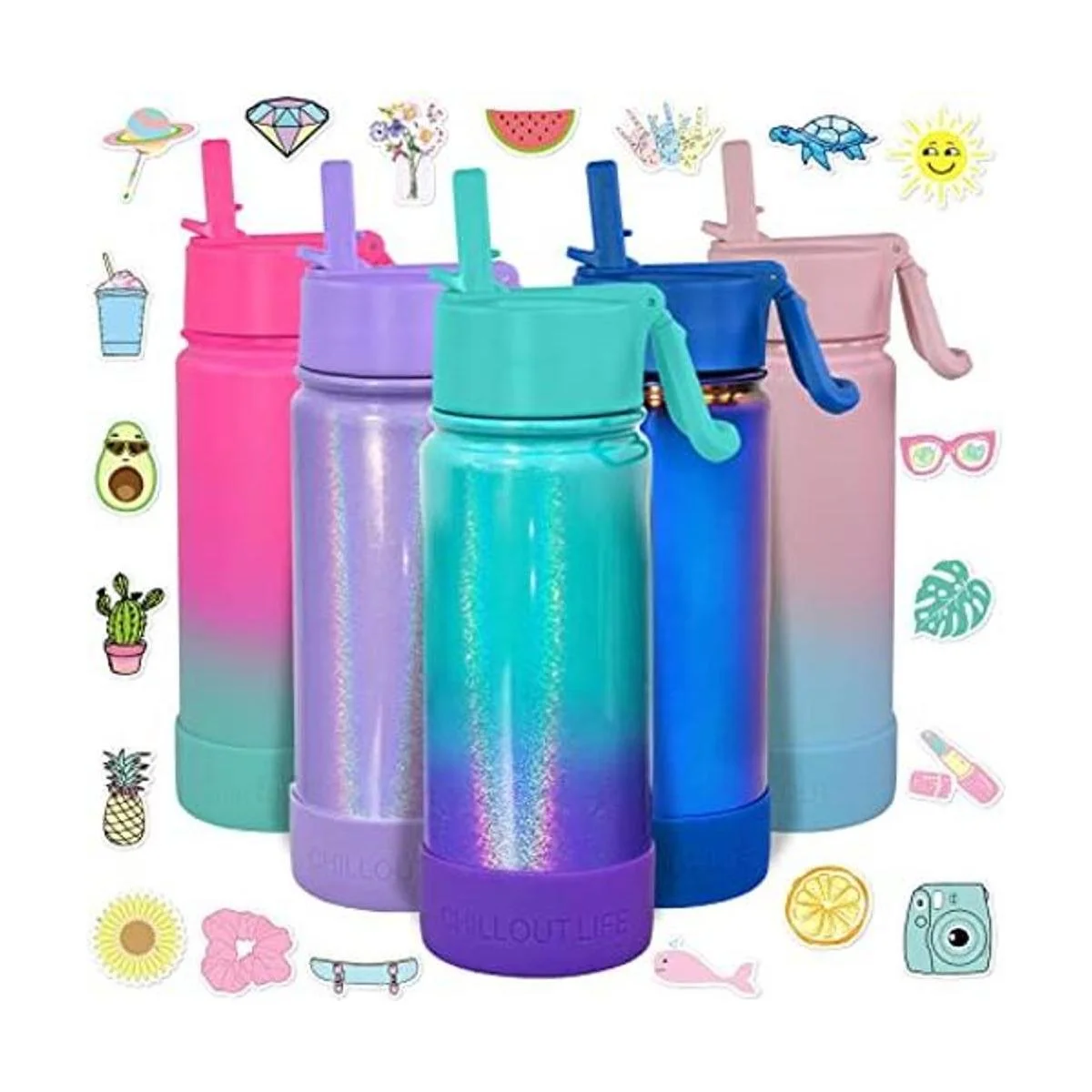 CHILLOUT LIFE Botella de agua aislada de 17 onzas con tapa con popote para niños y adultos 20 divertidas calcomanías impermeables Perfecta para personalizar la botella de agua de metal de tus hijos