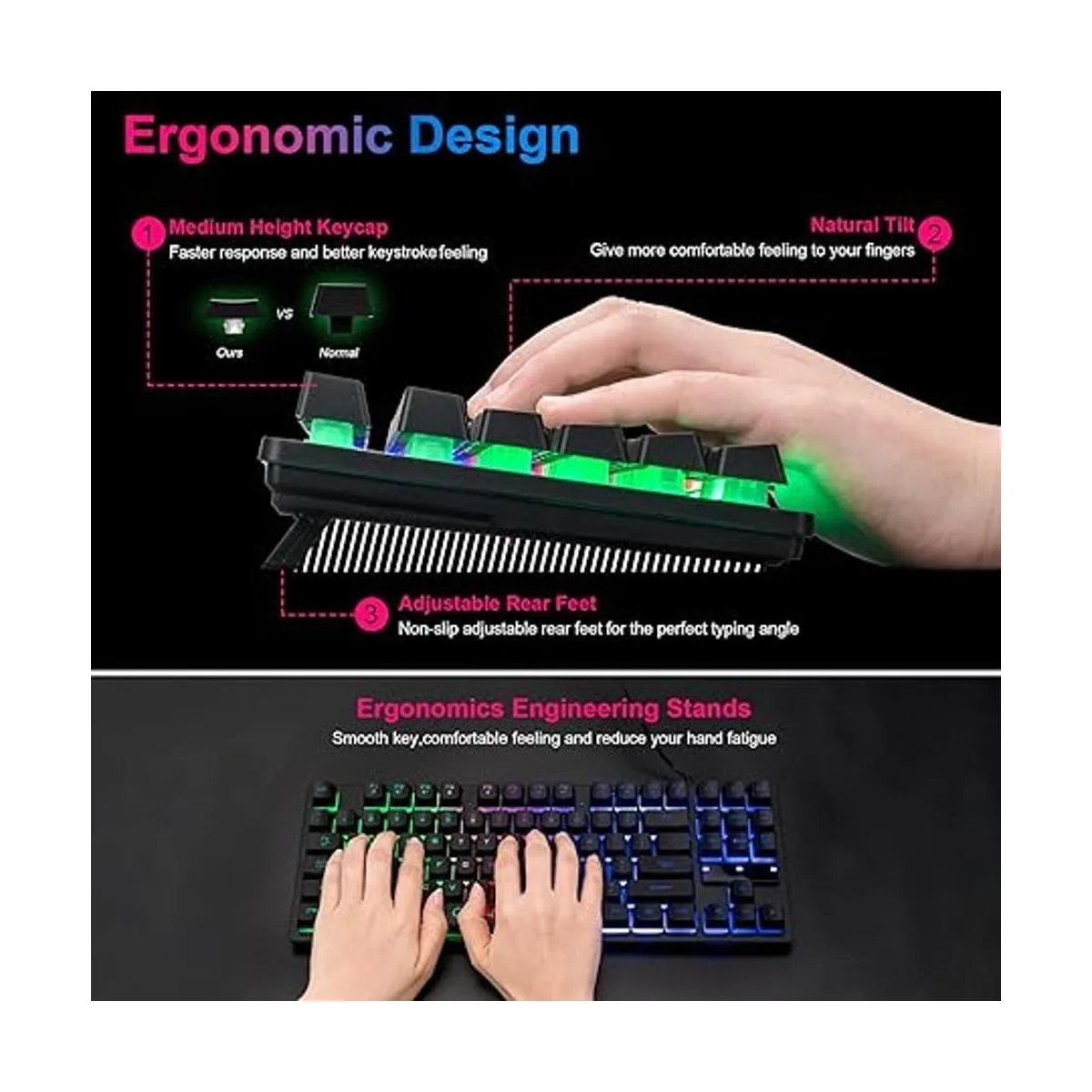 Diseño compacto de 87 teclas: no hay teclas numéricas adicionales, y hay más espacio de escritorio para que puedas mover el mouse para satisfacer tus necesidades en la oficina o en casa. Estarás satisfecho con el ahorro de espacio. Tamaño del teclado para juegos pequeño: 13.5 x 5.5 x 1.2 pulgadas.