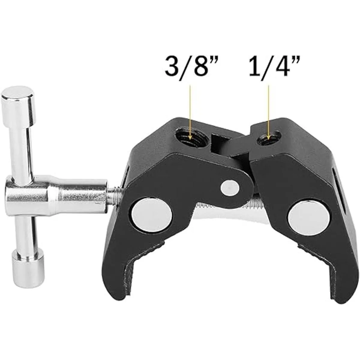 Super Clamp viene con rosca estándar de 1/420 y 3/816. Superabrazadera universal que se puede fijar en cualquier forma de cuerpo como cámaras, luces, paraguas, ganchos, estantes, placas de vidrio, barras transversales, etc.