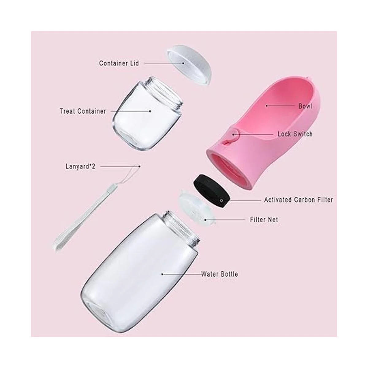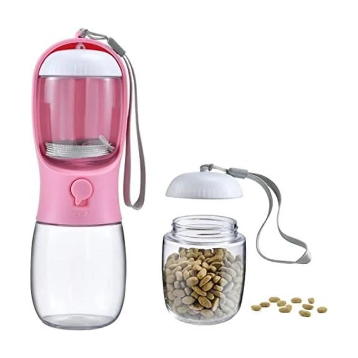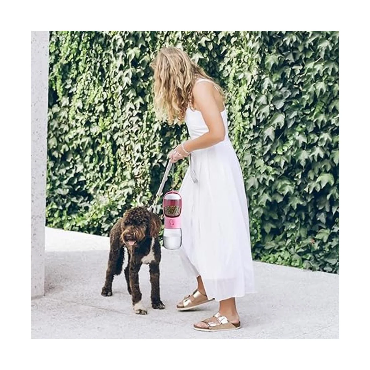Botella de agua para perros y recipiente para golosinas: en comparación con la botella de agua común para perros, hay un recipiente de alimentos de 3.53 oz que se fija estrechamente al cuenco de la botella de agua. El recipiente de golosinas es desmontable con otro cordón. Proporciona agua limpia y alimentos frescos cuando sales con tus mascotas.