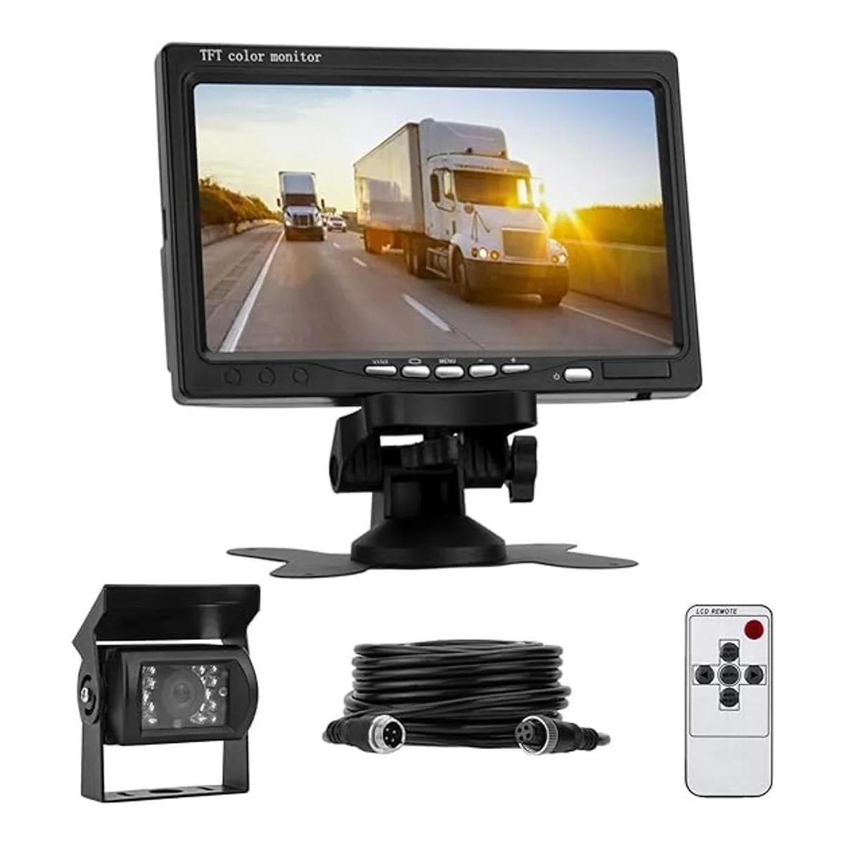 Juego completo de sistema de cámara de respaldo: cámara de visión nocturna de 18 LED, monitor LCD TFT a color de 7 pulgadas, cable conector de 4 pines. Gran kit de cámara de respaldo con cable con monitor de 7 pulgadas, especialmente diseñado para la mayoría de vehículos grandes de 12 V y 24 V, como camiones, caravanas, remolques de viaje, caravanas, tractores, autobuses, camiones, etc.