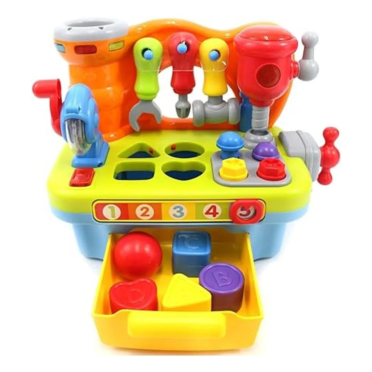 Los juguetes de banco de trabajo incluyen un taladro eléctrico, una motosierra, una abrazadera de banco con sonidos reales de herramientas, así como un martillo desmontable, un destornillador y una llave.