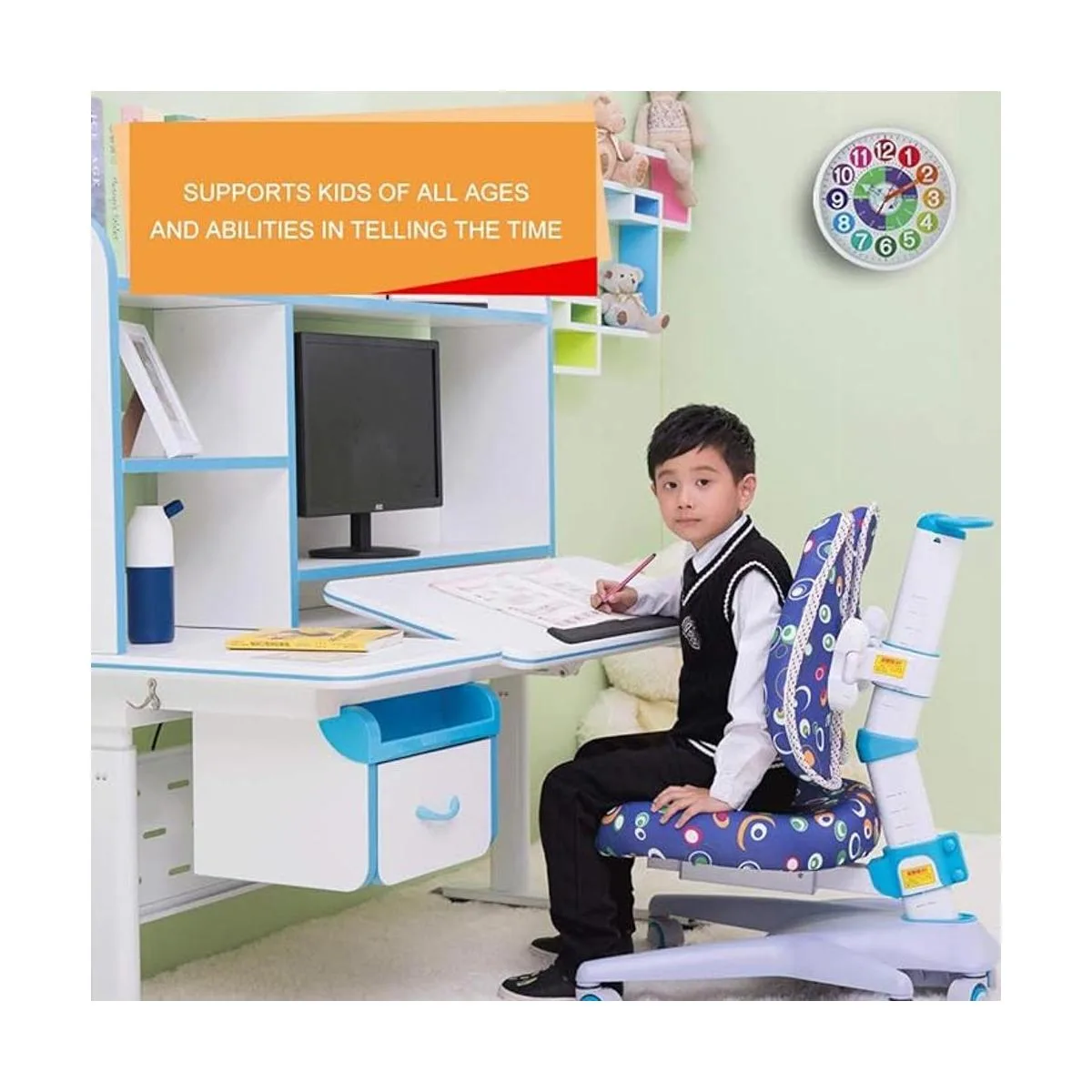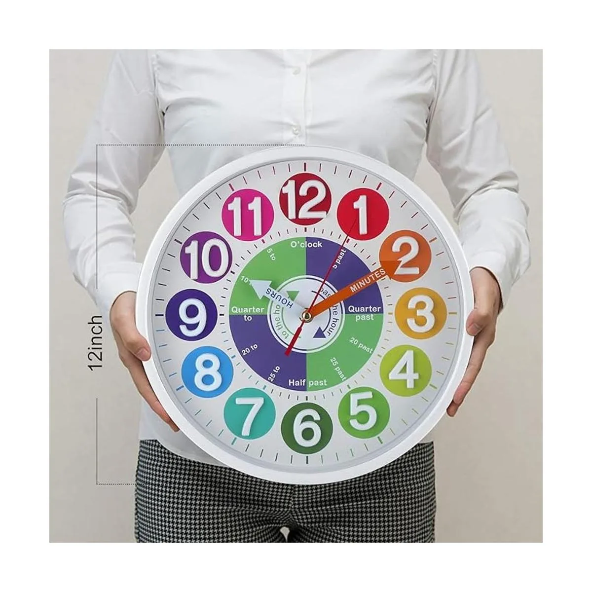 Fácil de colgar y ahorro de energía. Este reloj de aprendizaje analógico con gran agujero en la parte posterior del reloj, que puede ser fácil de colgar en la pared. Este reloj de aprendizaje será una gran decoración para sala de estar, aula, sala de juegos y dormitorio de los niños.