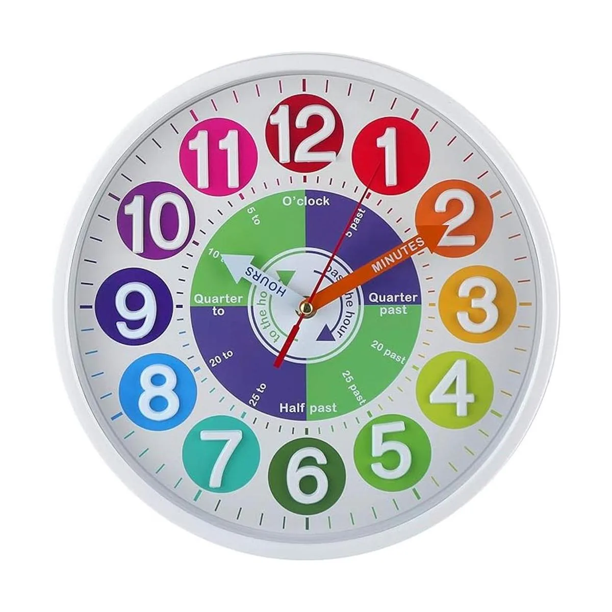 Enseña a tus hijos a decir la hora más fácil Este reloj de pared de diseño especial para niños viene con manecillas marcadas de hora, minutos y segundos, que pueden hacer que tu hijo los reconozca y los recuerde en breve. El cuarto pasado, medio pasado y cuarto también marcado en el reloj, por lo que es muy fácil saber y retener la hora.