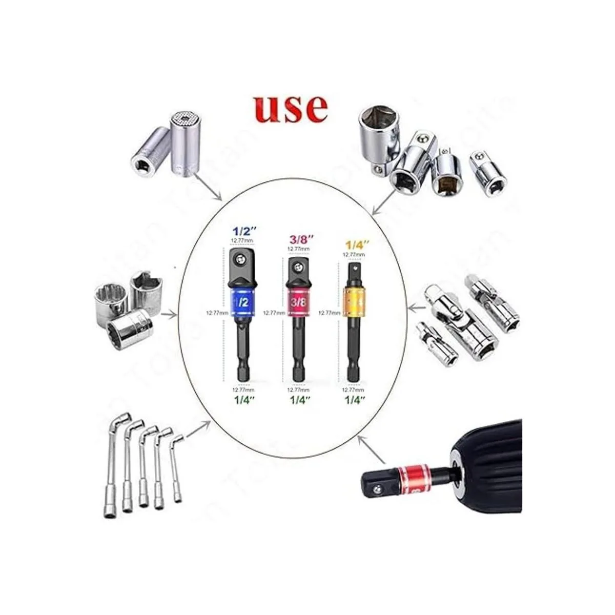 Multifunción3 piezas Se utiliza en la instalación de destornillador neumático, destornillador eléctrico, taladro neumático, destornillador manual y otras instalaciones para la herramienta hexagonal. Es un buen accesorio para la conversión. Para enchufe universal, adaptador de impacto y juego reductor, juego de juntas universales, adaptador de enchufe y juego reductor de transmisión, juego de barra de extensión de enchufe de impacto de transmisión, juego de llaves de impacto de transmisión.