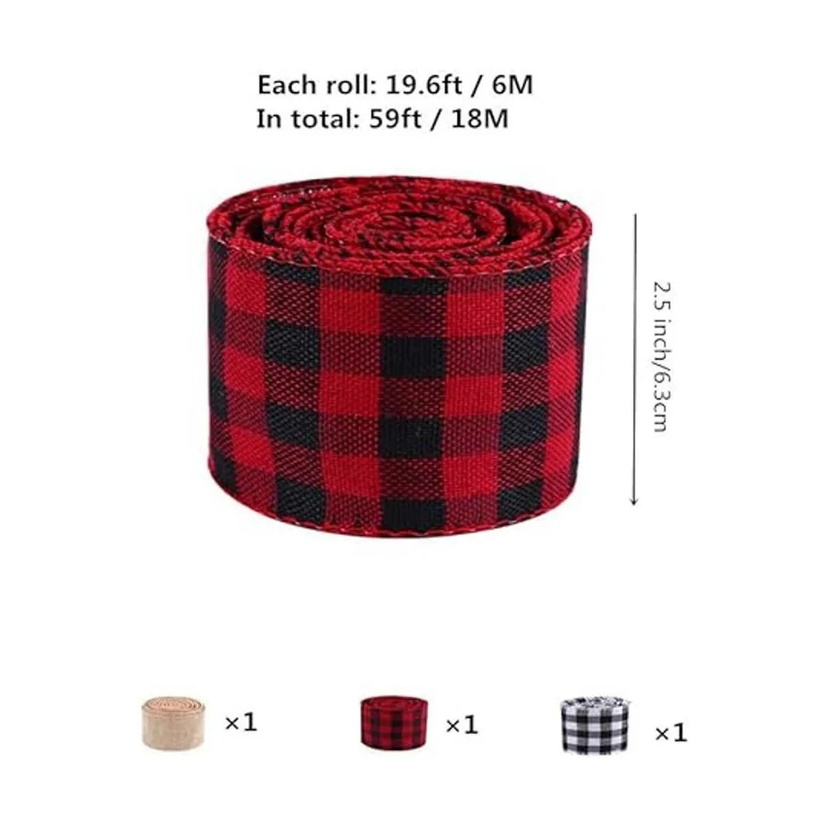 El paquete incluye 1 cinta de arpillera a cuadros rojos, 1 cinta de arpillera a cuadros negros y 1 cinta de arpillera natural, cada rollo mide 6.6 yardas y ancho: 2.5 in, en total 19.7 yardas/59.1 ft