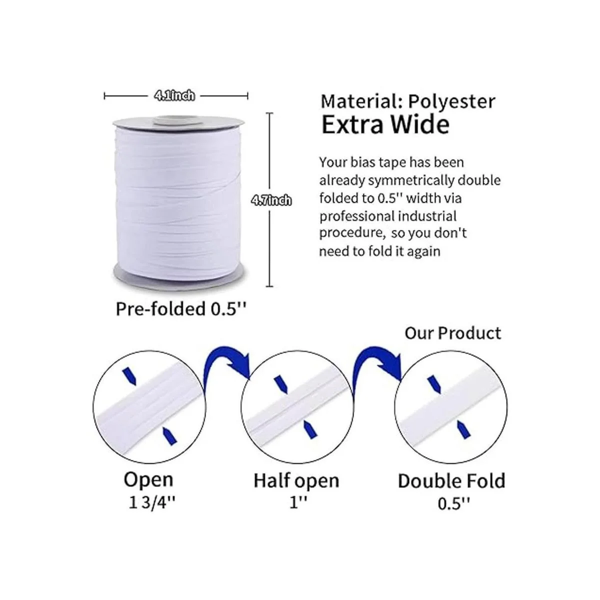 Cinta de bies de doble pliegue, cinta de bies doble pliegue de 12 pulgada para encuadernación de edredón, 55 yardas, cinta de poliéster preplegada blanca para coser, costura, manualidades, no elástica 0.512 in, 164.0 ft