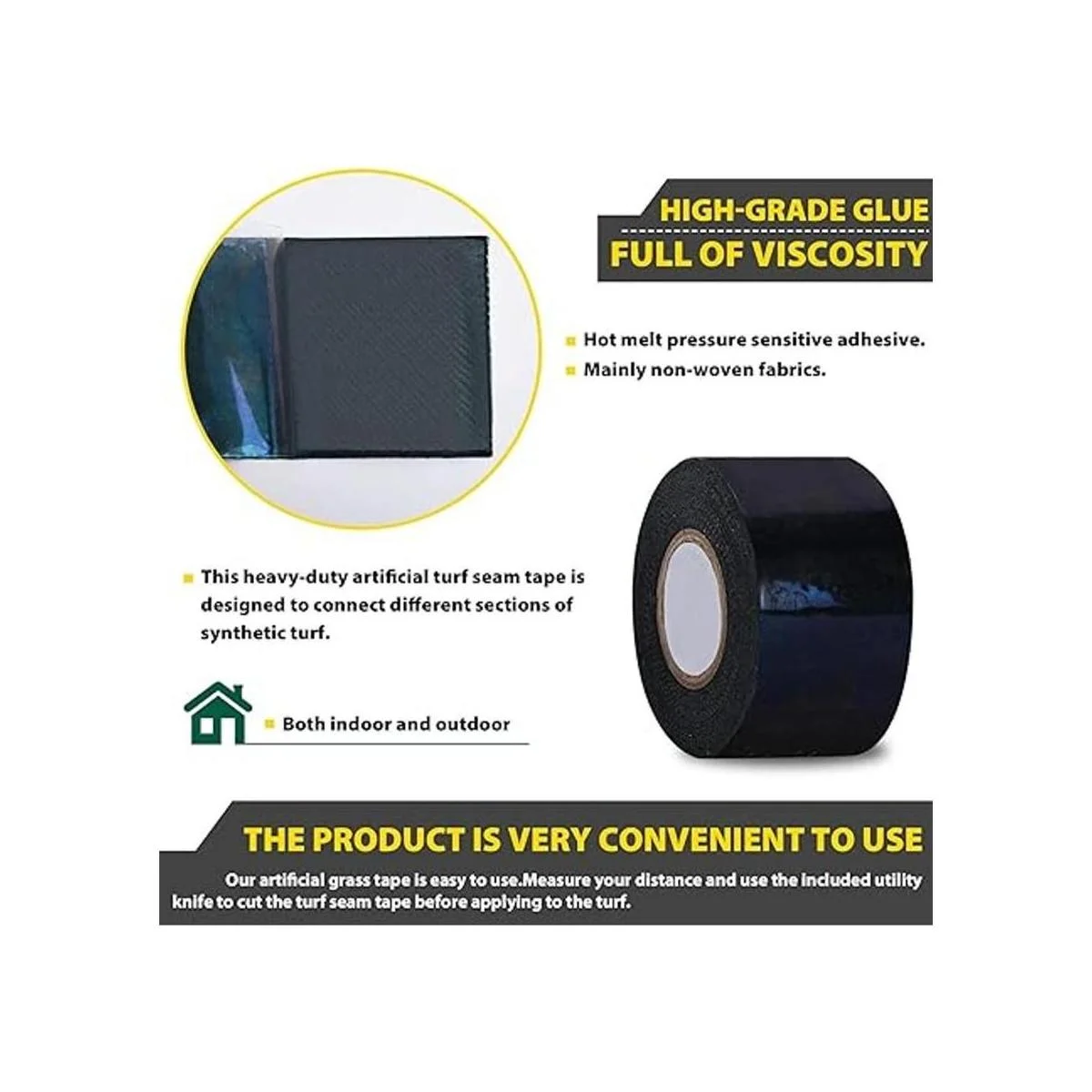 Material de alta calidad: cinta de costura de césped sintético hecha de tela no tejida con adhesivo sensible a la presión, revestimiento con pegamento termofusible. Es duradero con excelente adherencia, resistencia a la tracción superior y resistencia al desgarro