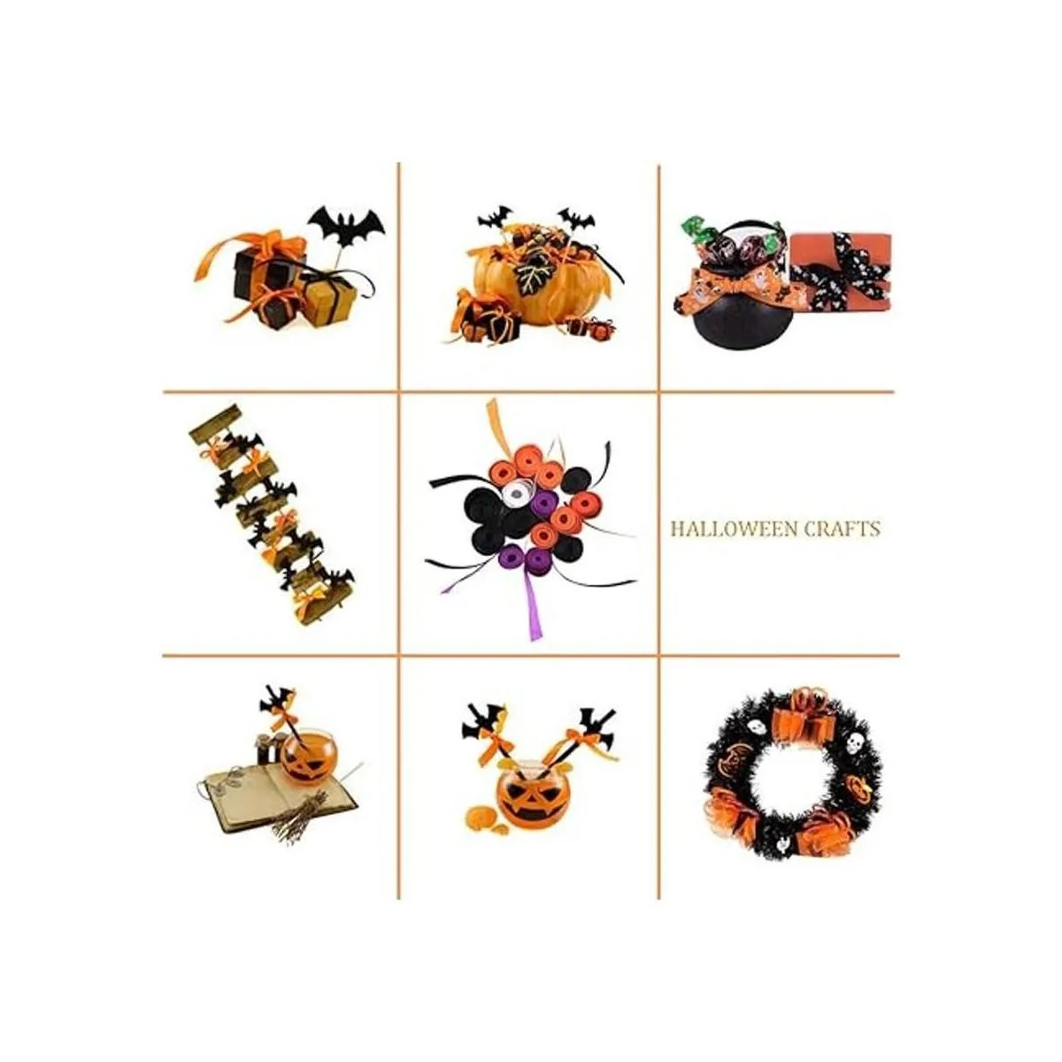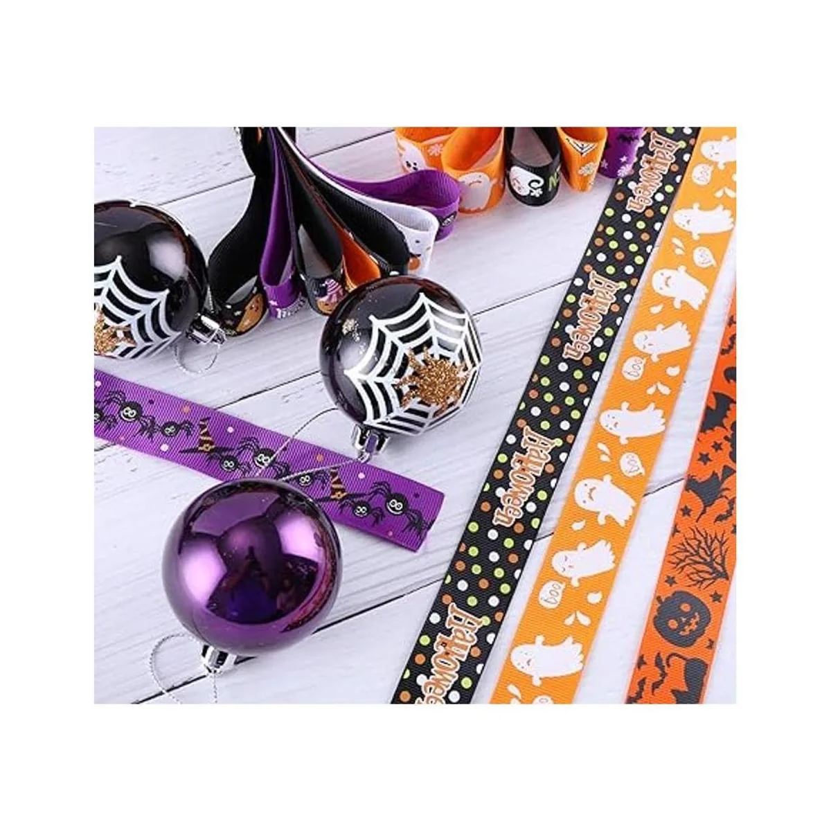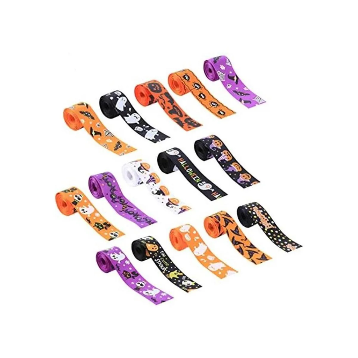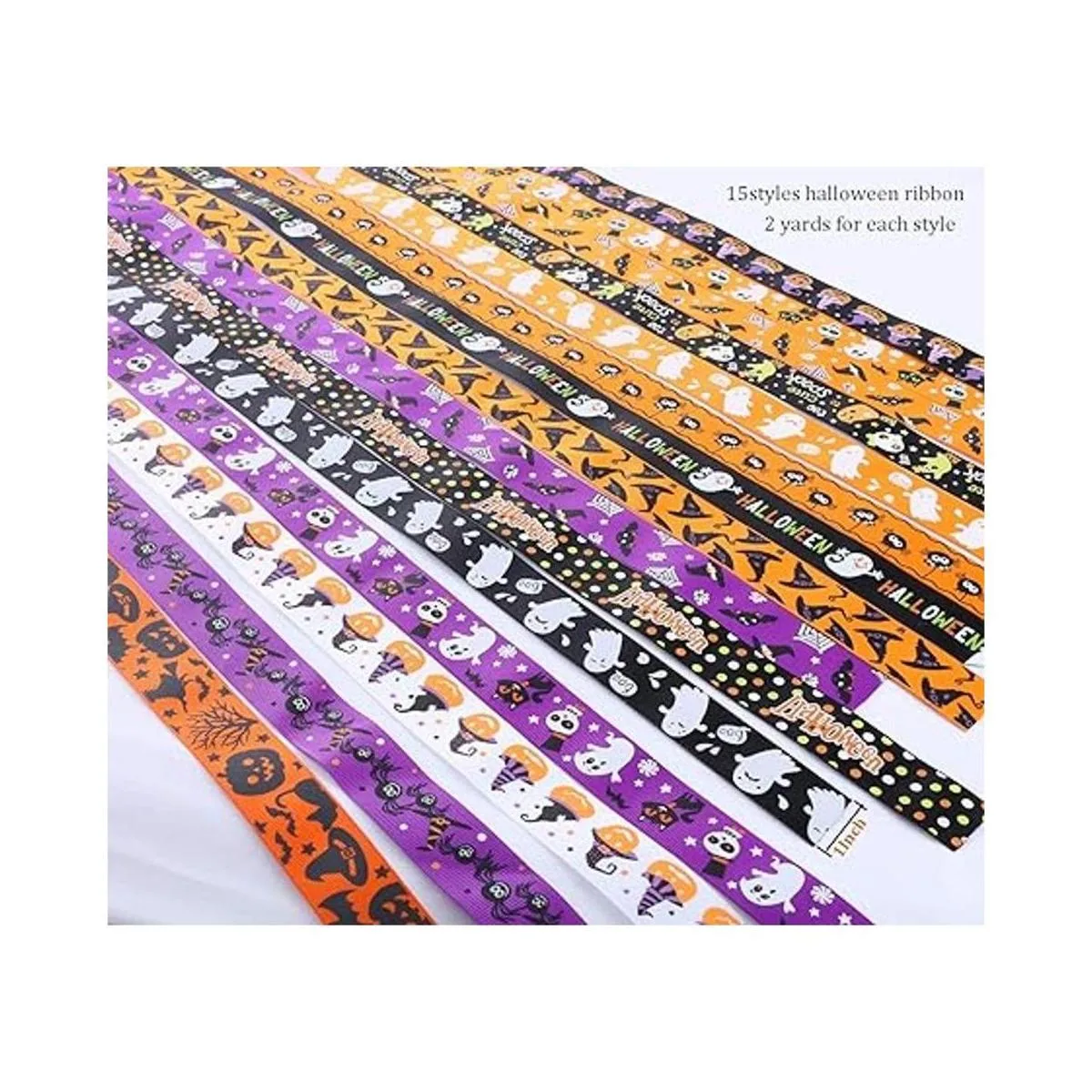Surtido de cintas de Halloween: recibirás 15 patrones de cintas de grogrén de Halloween en decoración naranja, morado, negro y blanco, cada cinta de Halloween para manualidades mide aproximadamente 0.984 in de ancho y 2 yardas de largo, total 30 yardas, suficiente para satisfacer tus necesidades decorativas o de bricolaje en Halloween u otras vacaciones.