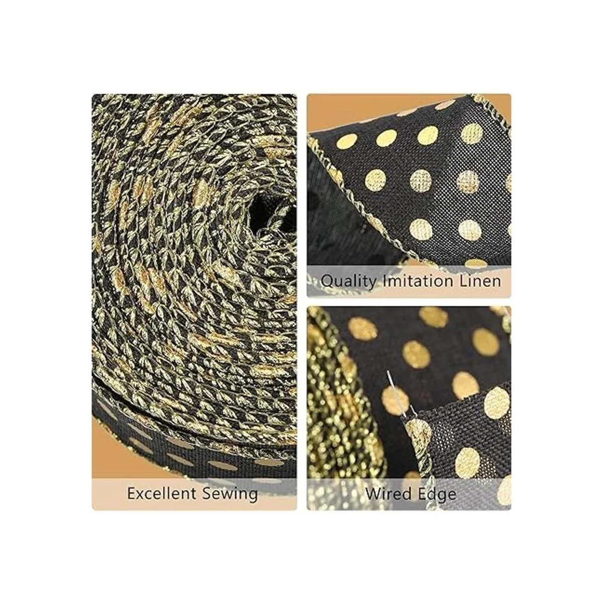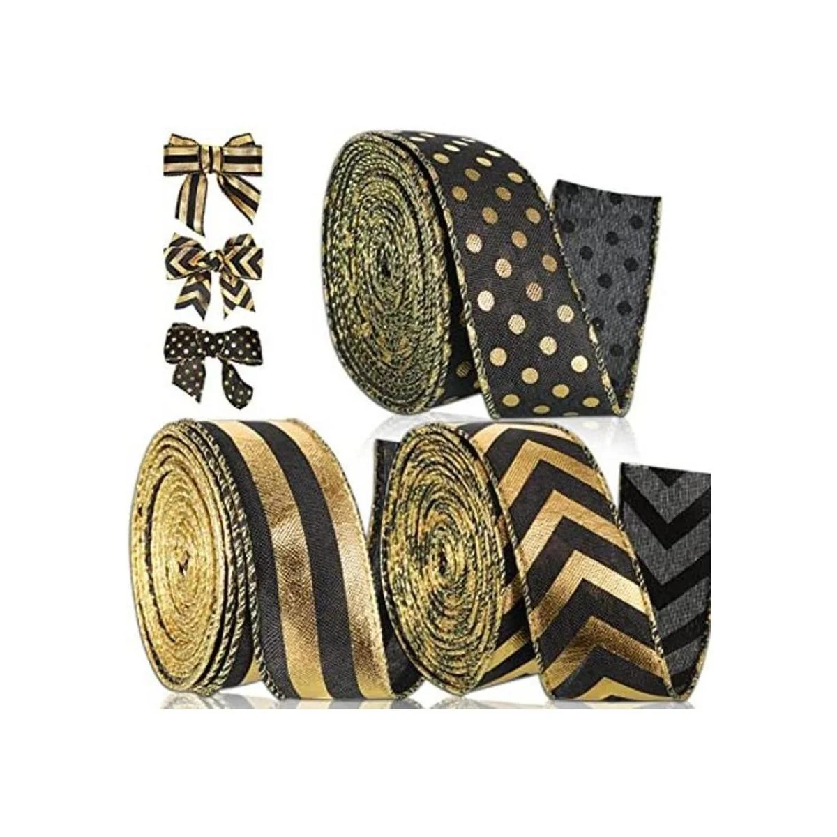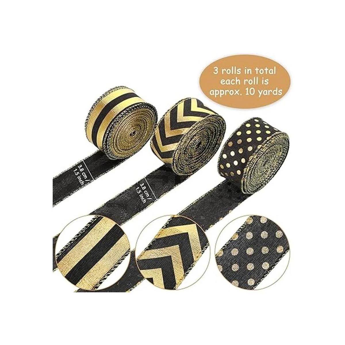 Cinta de Navidad de 1.5 pulgadas con alambre de arpillera para corona, rayas, puntos para decoración de árbol de Navidad, manualidades, 3 rollos negro y dorado