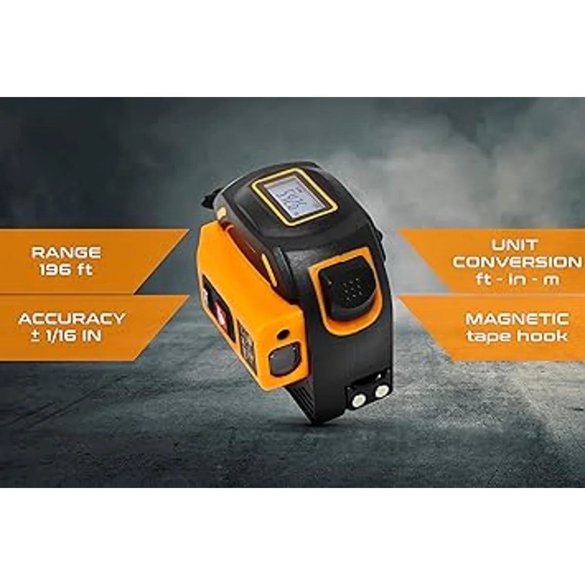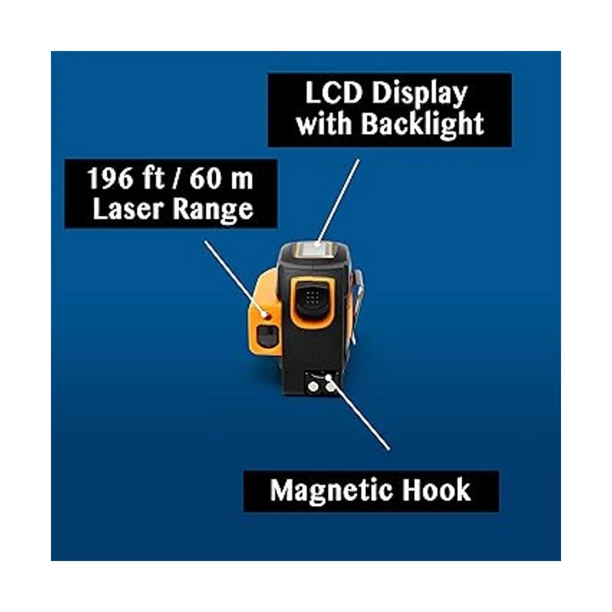 Cinta métrica láser 2 en 1, métrica láser de 196 pies, cinta métrica de 16 pies y unidades estadounidenses con pantalla digital LCD, gancho magnético movible, conversión de unidades, construcción resistente, consistente y preciso