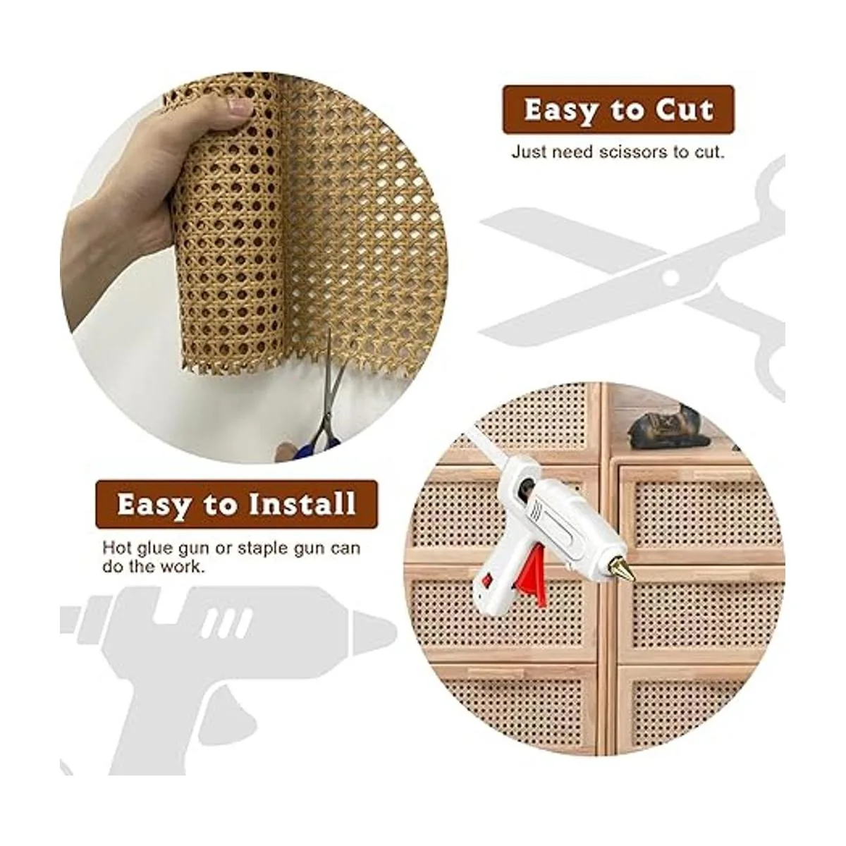 Nuestra correa de caña de ratán de polietileno es ideal para muchos muebles de madera y proyectos de manualidades. Ya sea para reparar o decorar fundas de asiento vintage, pantallas, sillas o puertas de armario.