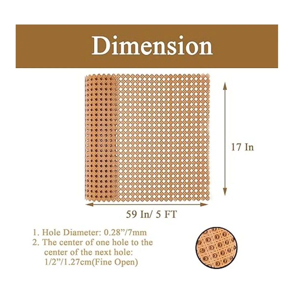 La hoja de ratán de plástico mide aproximadamente 17 x 59 pulgadas, el diámetro del agujero es de aproximadamente 0.28 pulgadas y mide 1/2 pulgadas desde el centro de un agujero a otro cincha de caña abierta fina.