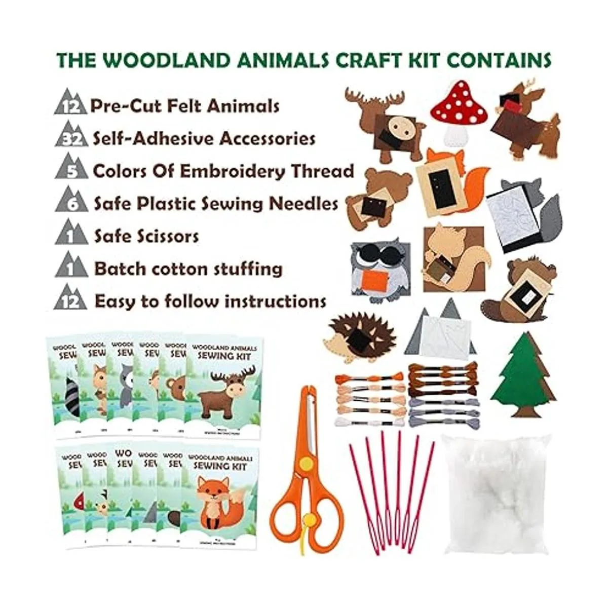 WOODLAND ANIMALS SEWING KIT FOR KIDS Here is the ultimate set of 12 different woodland plush animals sewing patterns This kit contains 12 precut felt animal shapes, 32 selfadhesive accessories, 6 colors of embroidery thread, 6 safe plastic sewing needles, 1 safe scissors, 1 batch cotton stuffing, 12 easy to follow instructions. Minimal adult supervision needed