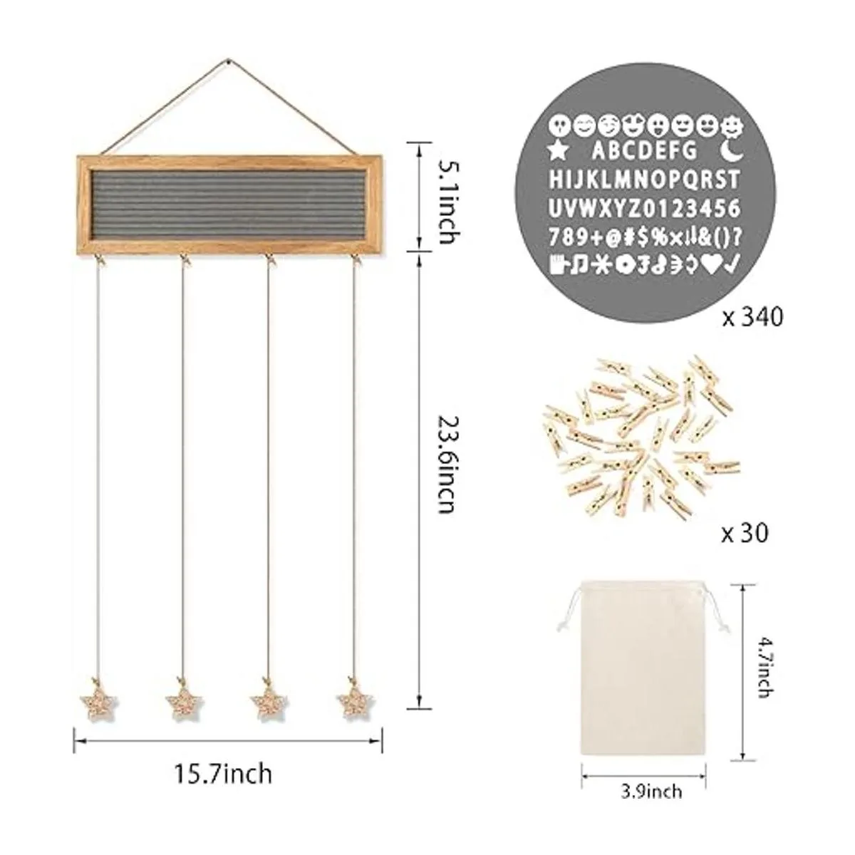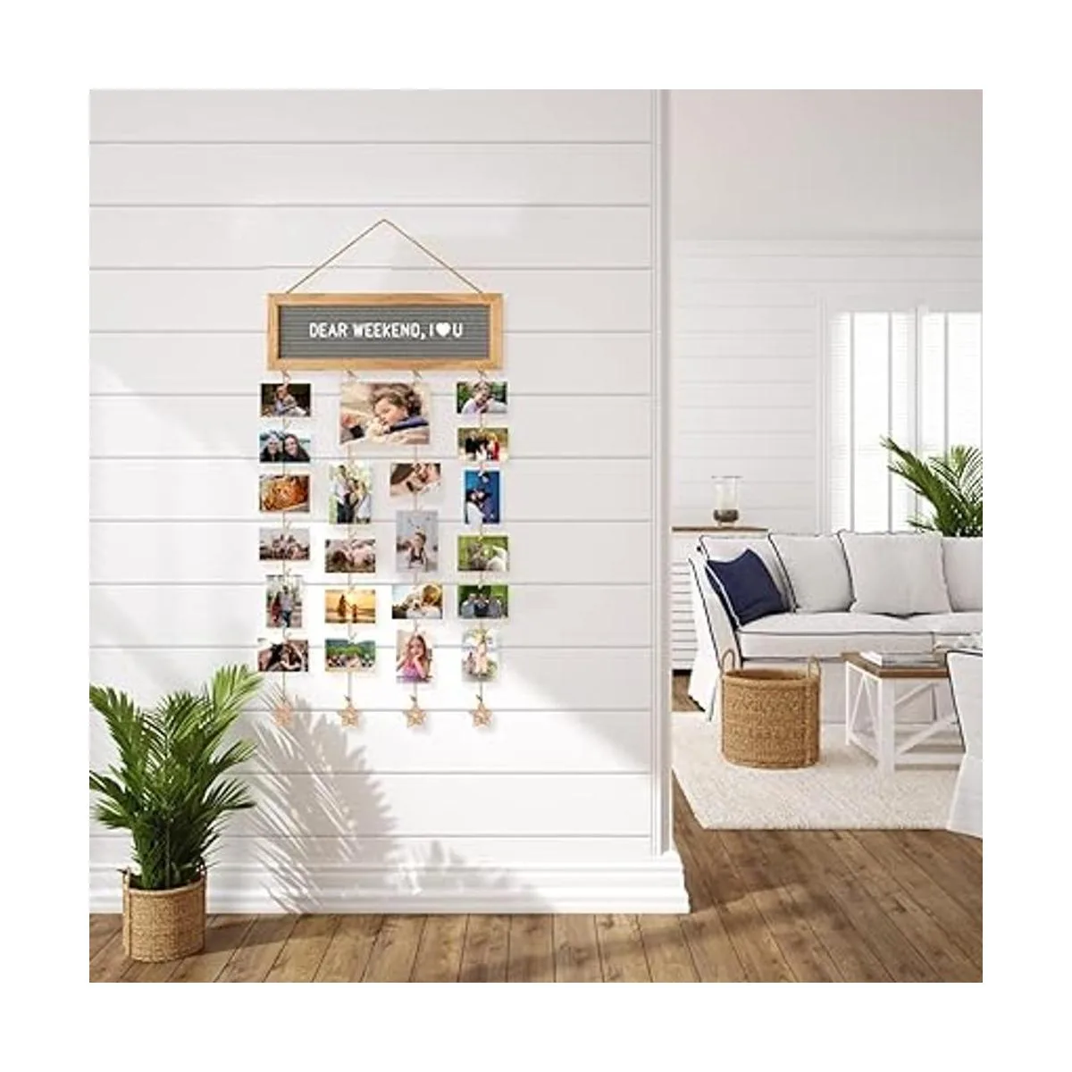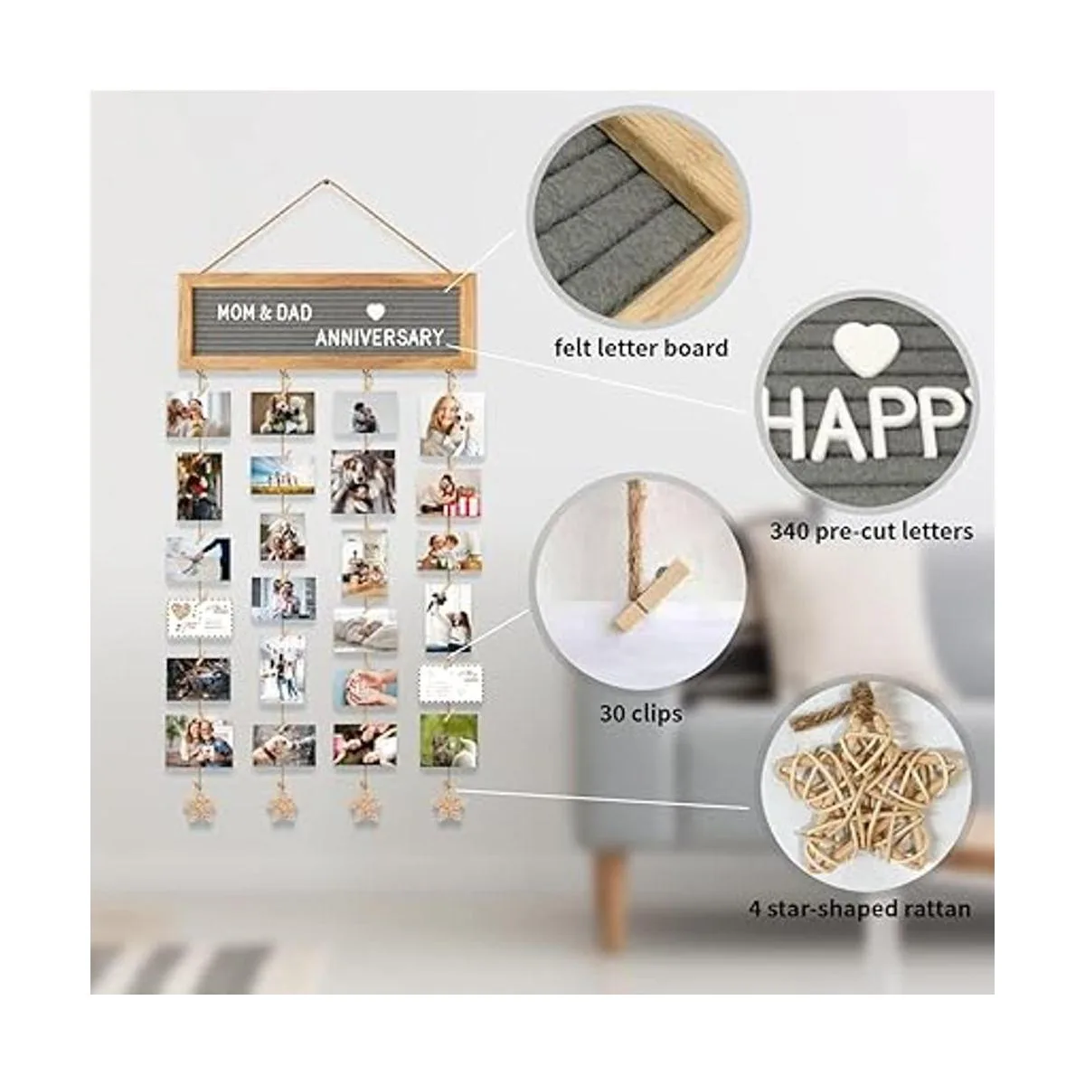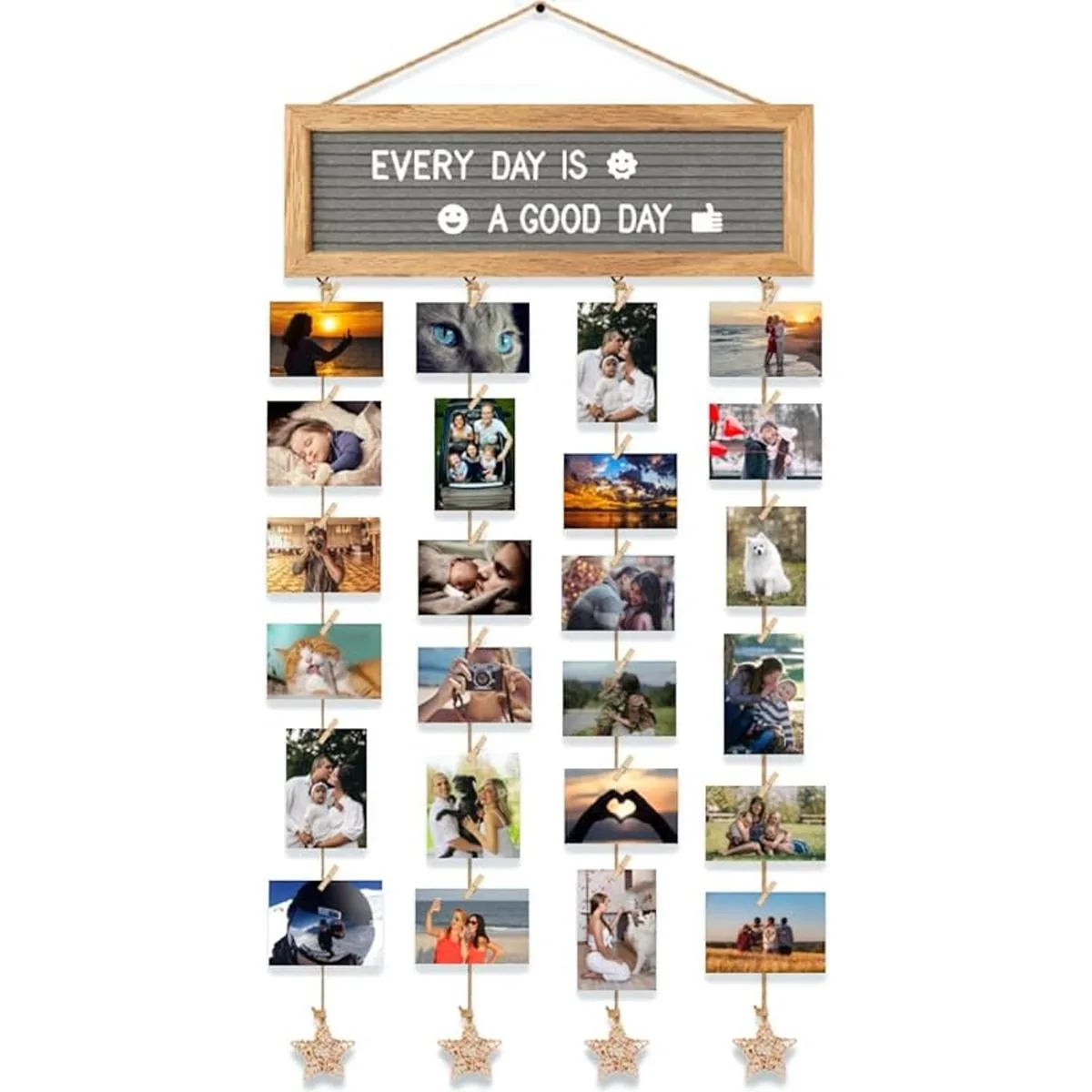 Juego de marcos de fotos creativos: esta exhibición de fotos colgante viene con un tablero de letras de fieltro, 340 letras precortadas en una bolsa de tela, 30 clips y 4 cuerdas de cáñamo con ratán en forma de estrella. Reemplaza fácilmente tus letras y símbolos favoritos en el tablero, ajusta la longitud de la cuerda de cáñamo y los clips para cambiar la foto, una forma simple y creativa de decoración de bricolaje.