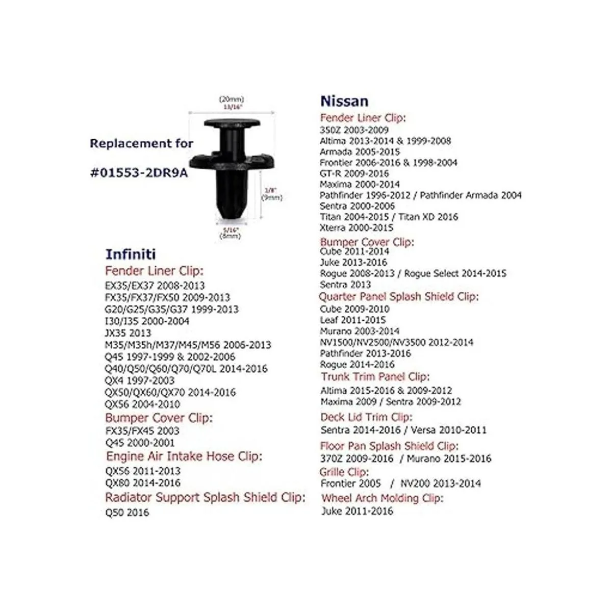 Premium OEM Upgraded Quality and Durable Nissan clips with Fastener RemoverMade of Premium Auto Grade Nylon. PA66 is much more durable than OEM ones, Wont break like other cheap clips caused by the bad weather and vibration.100 same size with your original OEM retainers.
