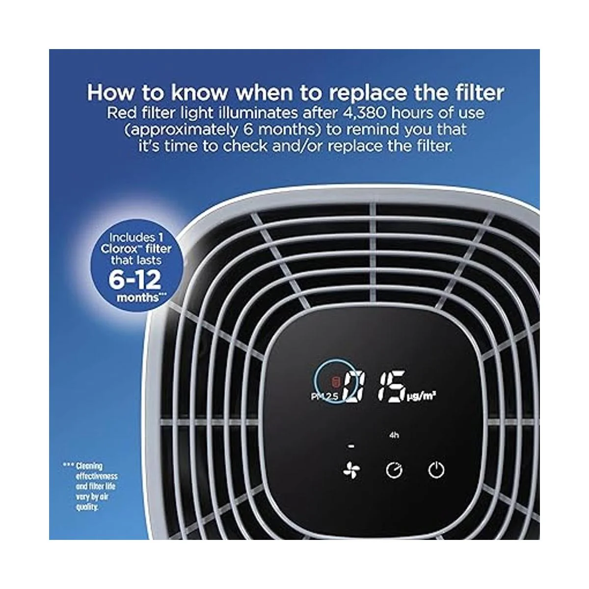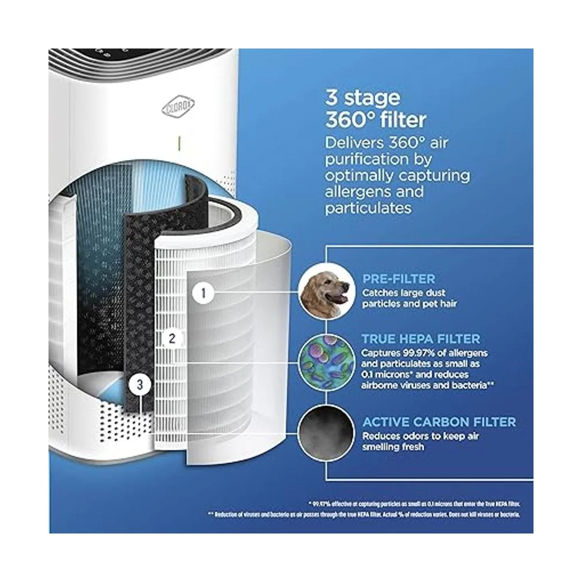 Captura el 99.97 de los alérgenos y partículas y reduce virus y bacterias. Con el filtro de repuesto Clorox 320 Large Room True HEPA, puedes respirar más fácilmente. Tiene una verdadera filtración HEPA para capturar el 99.97 de partículas tan pequeñas como 0.1 micras y 2 filtros adicionales para capturar partículas y olores más grandes.