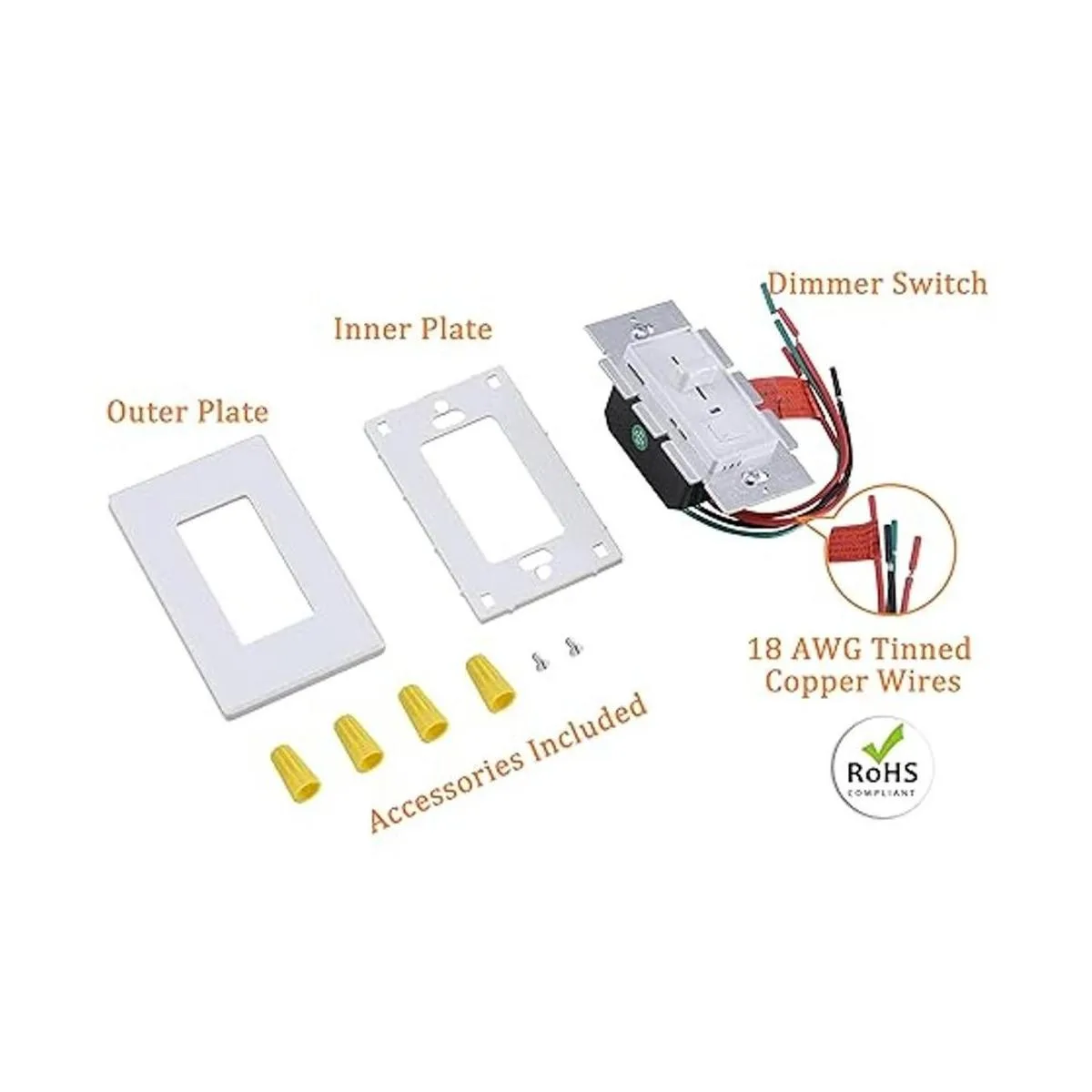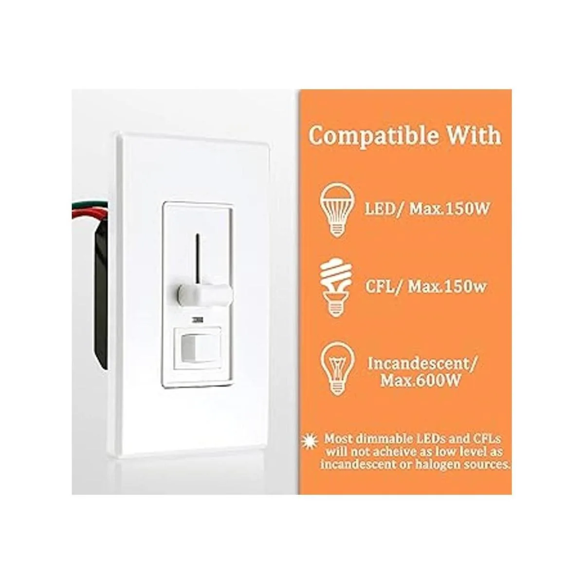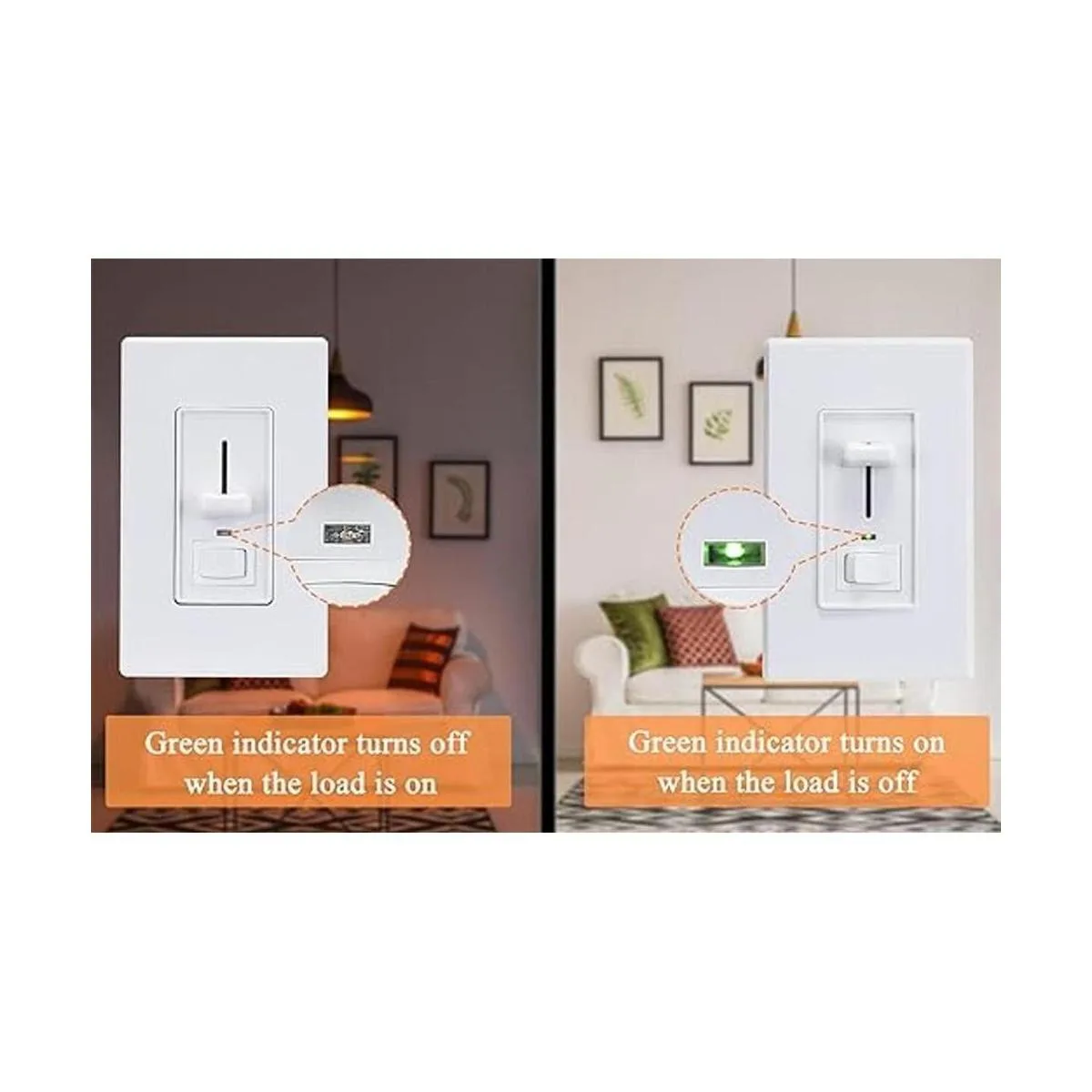 Cloudy Bay Interruptor de atenuación de pared con indicador verde, para luz LEDCFLincandescente, deslizamiento regulable de 3 vías, 600 W máximo, placa de cubierta incluida, color blanco