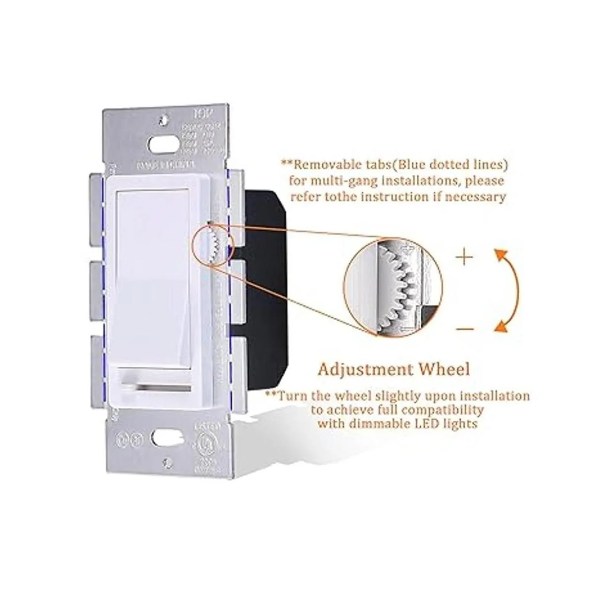 Cloudy Bay Interruptor de atenuación de pared para luz LED CFL incandescente, deslizador regulable de 3 vías, de un solo polo, 600 W máx, placa de cubierta incluida