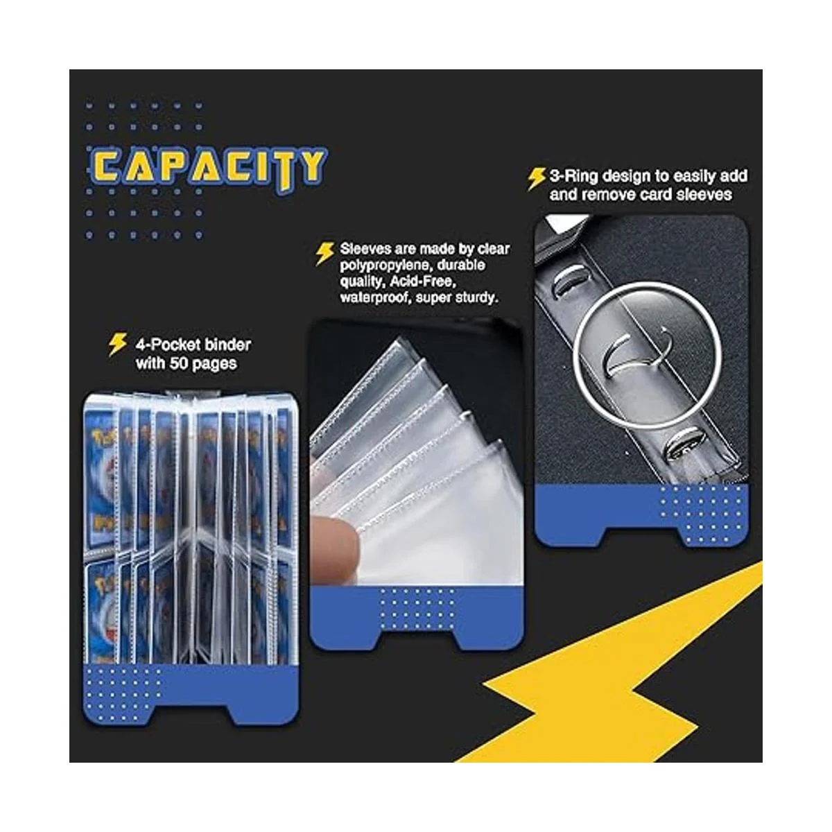 Sabemos lo que quieres: nuestro soporte para tarjetas de intercambio de 3 anillos está diseñado para mayor comodidad al añadir o quitar hojas. Esta carpeta de colección de tarjetas de 4 bolsillos tiene 50 páginas de hojas protectoras de doble cara. Capacidad para hasta 400 tarjetas, proporcionando un montón de espacio para organizar todas tus tarjetas y es fácil de llevar, porque mostrar tu colección es la mitad de la diversión