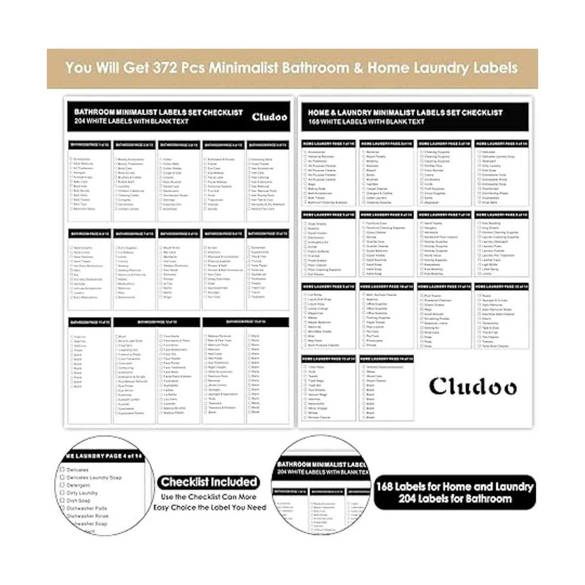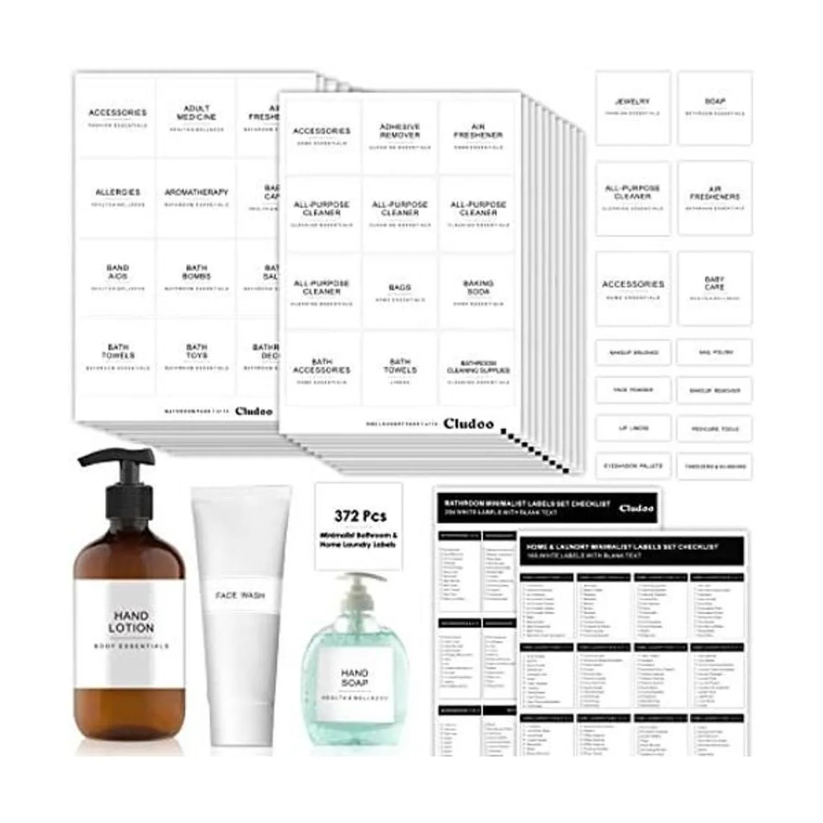 Cludoo 372 etiquetas de lavandería para el baño y el hogar para organizar con etiquetas en blanco, preimpresas, minimalistas, resistentes al aceite, para baño, lavandería, hogar, belleza, suministros de organización