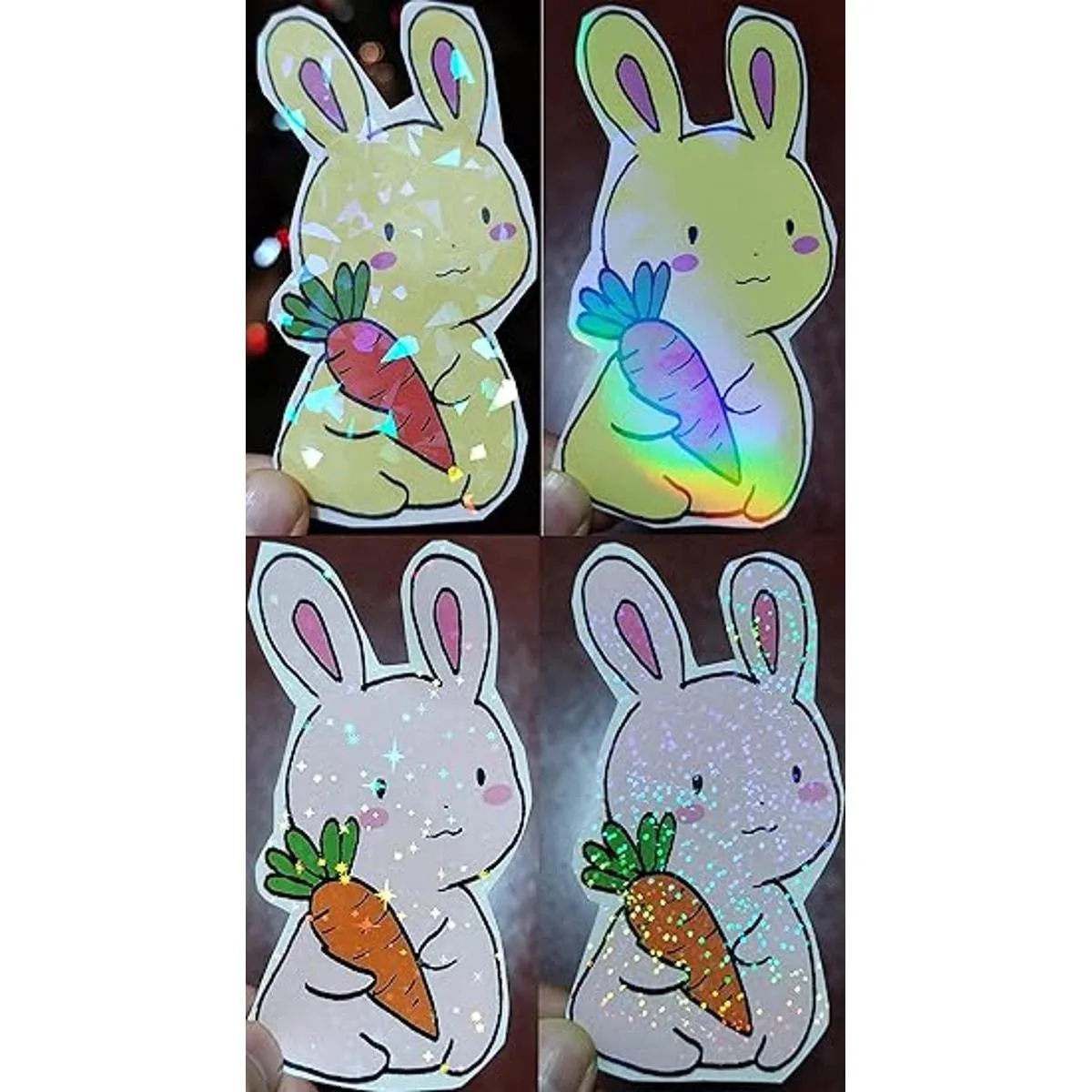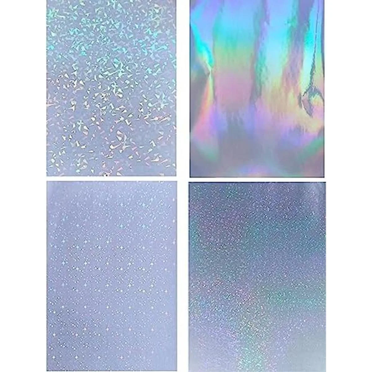 1. 24 hojas holográficas de tamaño A4 laminadas en frío de alta calidad, hojas autoadhesivas que incluyen 4 patrones diferentes diamante roto, transparente, estrellas, diamantes, 6 hojas para cada patrón