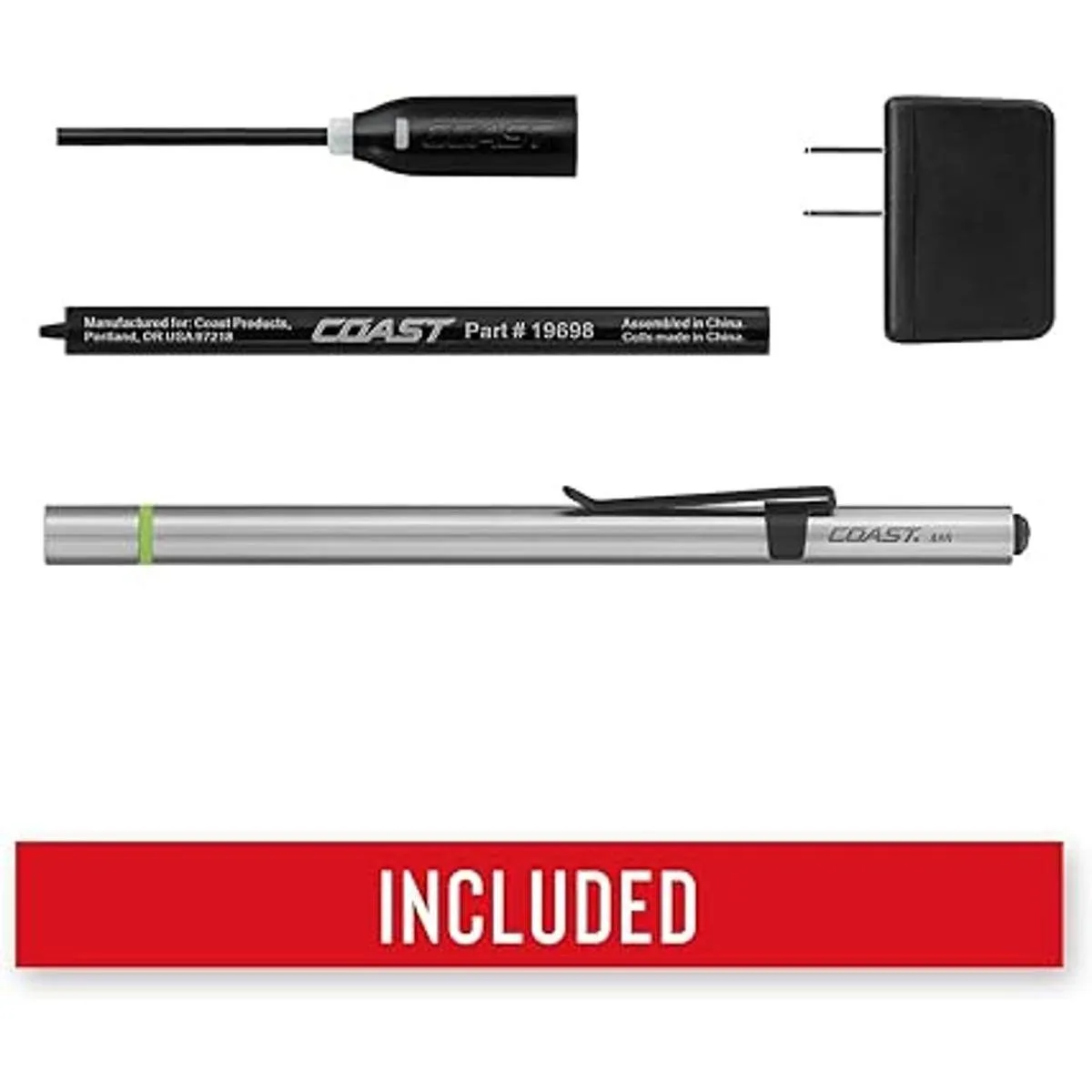 Tapa de carga: para recargar el bolígrafo, simplemente vuelve a cubrir la luz. Carga con CA, CC o USB. Todos los adaptadores incluidos.