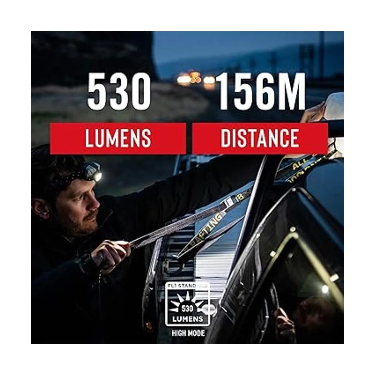 SPECS: Light Output: 530 lumens high, 65 lumens low. Beam Distance: 156 meters high, 54 meters low. Runtime: 2.15 hours high, 11 hours low.