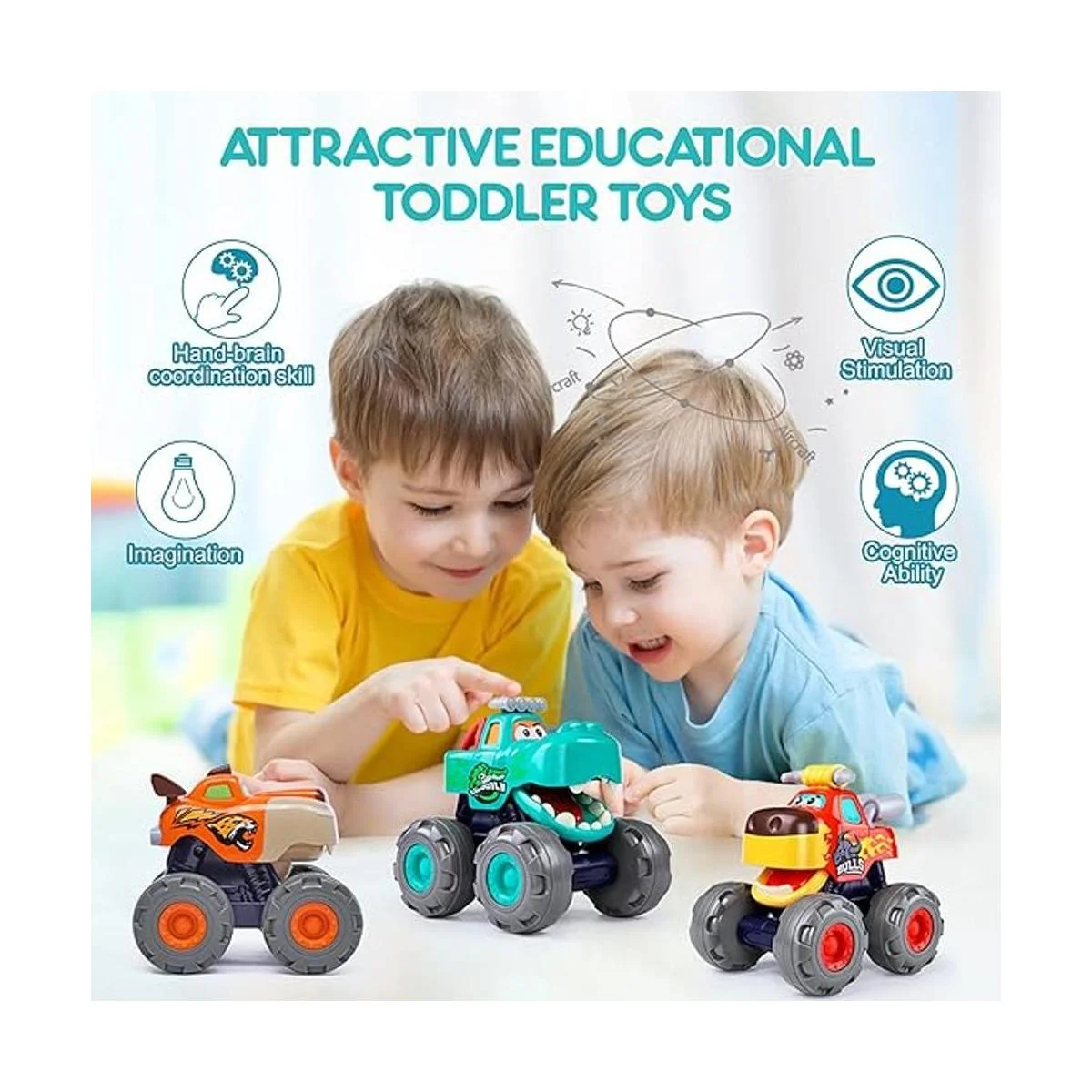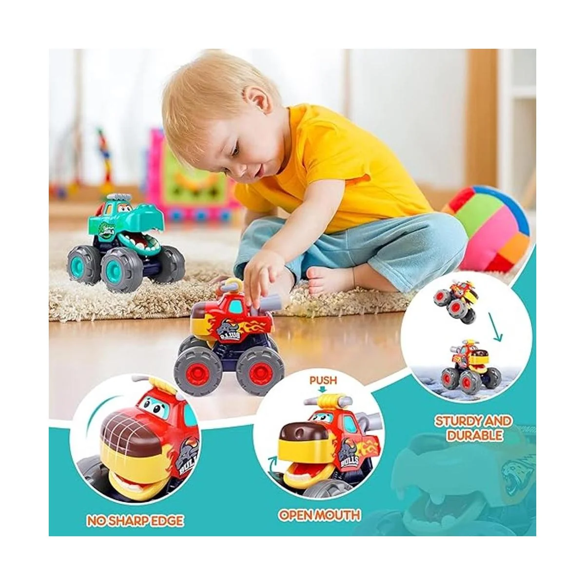 Tamaño perfecto para niños: el juguete de camión monstruo es de 3.5 x 4.3 x 4.7 pulgadas, diseñado para niños de 1 2 3 años, perfecto para manos pequeñas para sostener y empujar, muy práctico para llevar donde quiera que vaya tu bebé. El juego de juguetes para el vehículo infantil, ya sea en la sala de juegos o en el exterior. Grandes juguetes de viaje para niños y niñas de 12 a 18 meses.