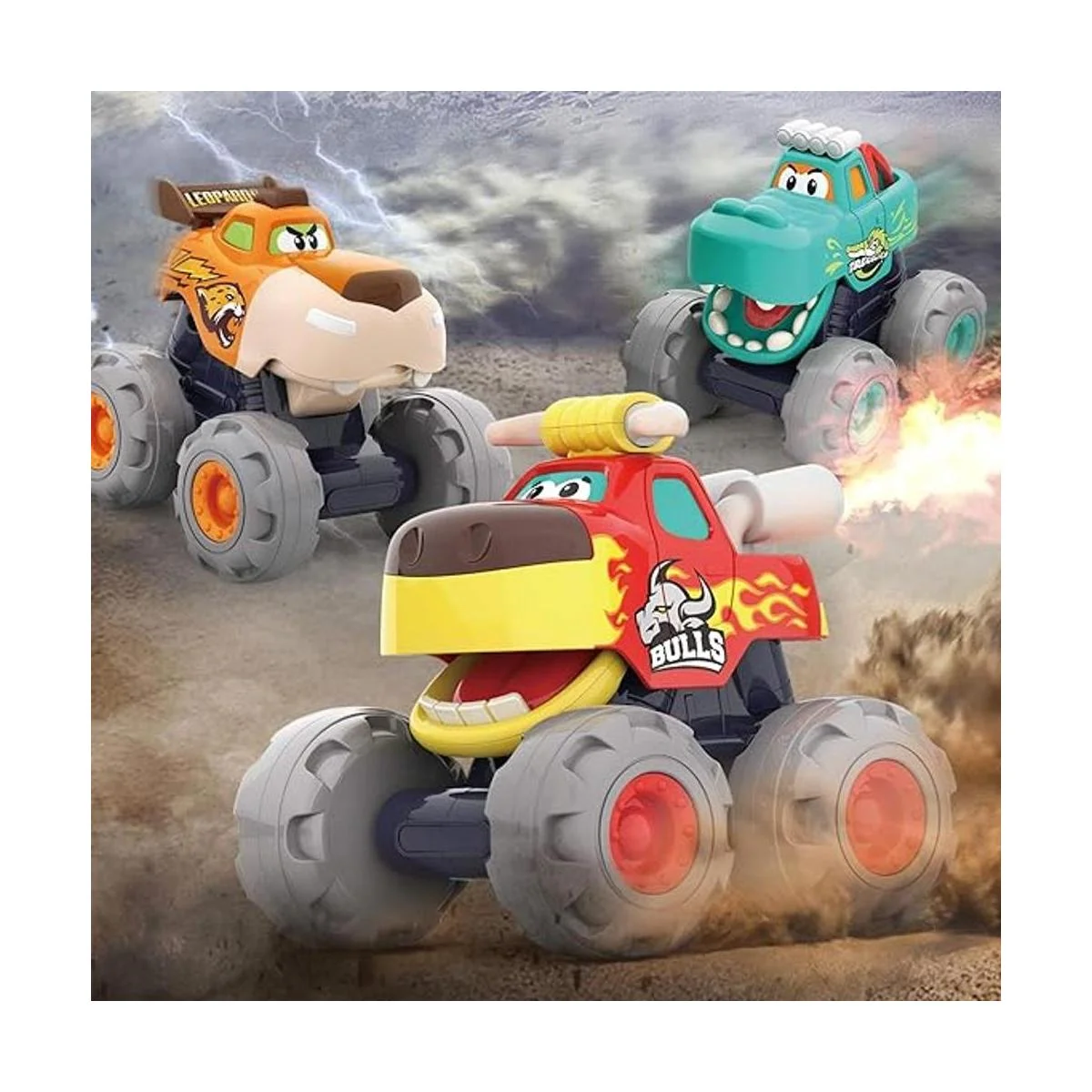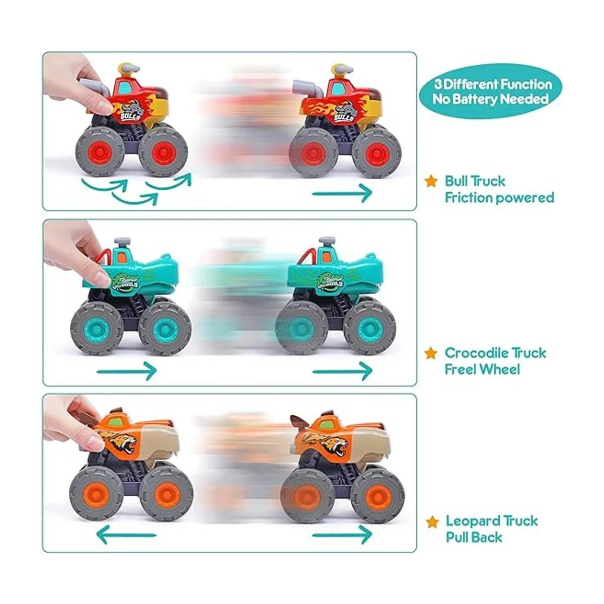 Divertidos coches de juguete monstruo: 3 coches de juguete únicos incluyen un camión toro, camión leopardo, camión de cocodrilo. Con la ayuda de diferentes potencias para ir: hacia atrás y hacia adelante, tirar, empujar y ir. Cuando presiona el botón del coche de juguete, abre la boca y mira los dientes, atrae la atención de tu hijo. 3 juguetes de camión de animales salvajes que exponen a los niños a nuevas ideas de jugar y diversión sin fin.