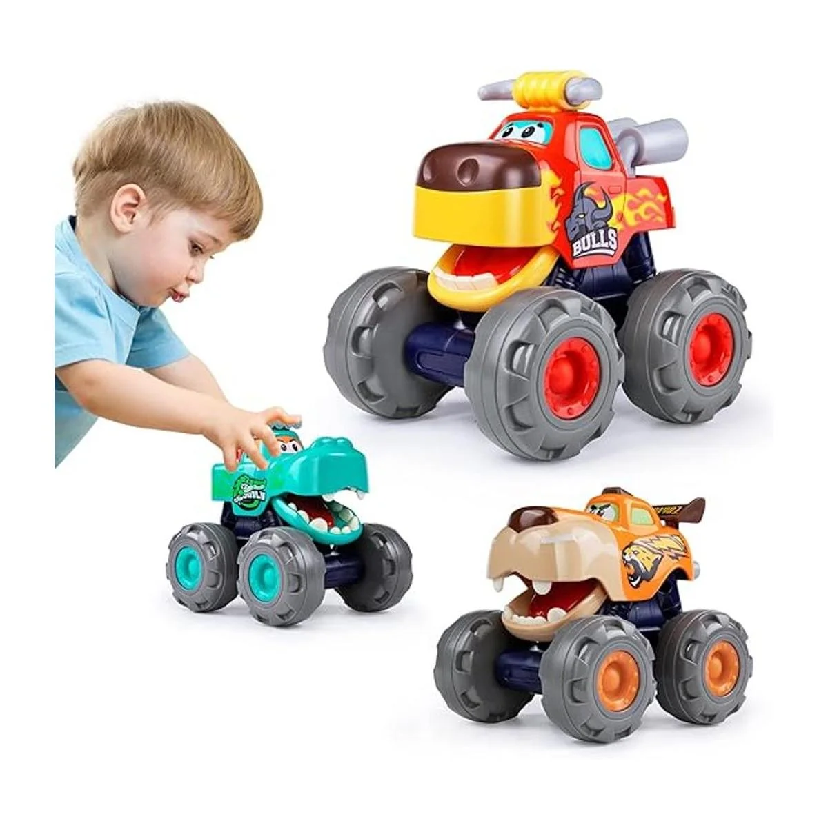 Coches de juguete para 1, 2, 3 años de edad, 3 unidades de juguetes Monster Truck Push Go Cocodrilo Cocodrilo Accionado por fricción, Coche Toro Retroceso, Coche de Leopardo, Rueda Grande, Juguete de Juguete de Bebé Regalo para niños de 12, 18 meses y niñas
