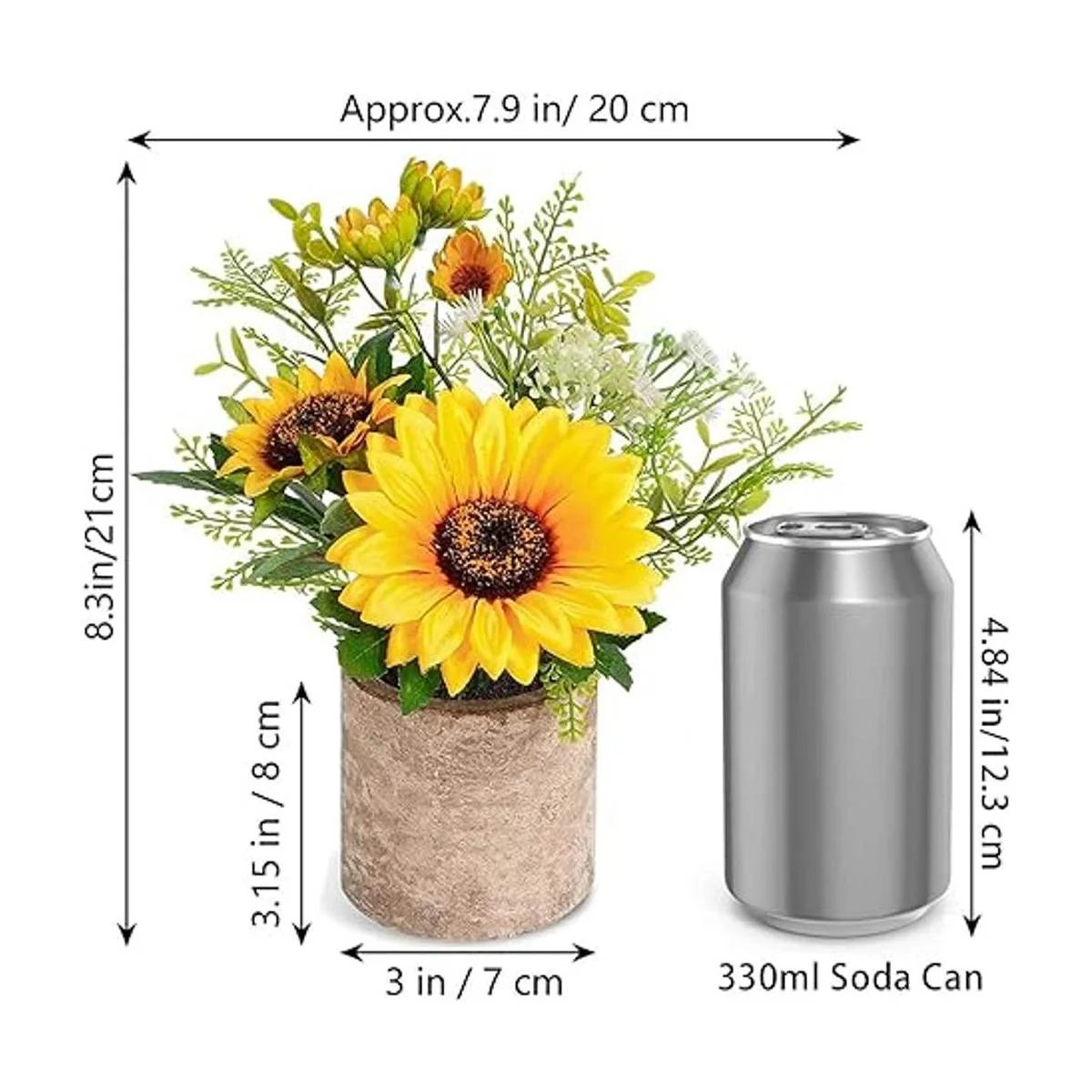 Tamaño: el diámetro de la maceta es de 2.8 in y la altura es de 3.1 in. La altura total de la maceta desde la parte superior de la planta hasta la parte inferior de la maceta es de 8.3 in.