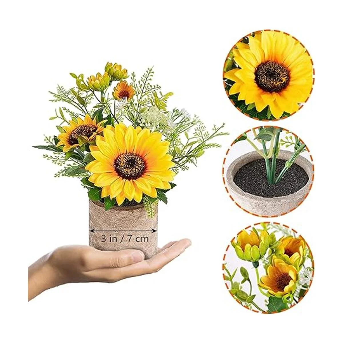 Material: el girasol está hecho de seda y plástico de alta calidad. La maceta inferior está hecha de pulpa de alta calidad, y cada maceta de pulpa tiene tierra de espuma artificial simulada, la planta en maceta se ve muy realista.